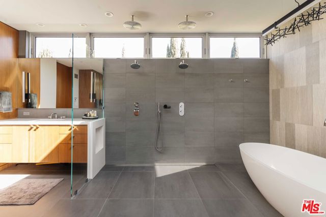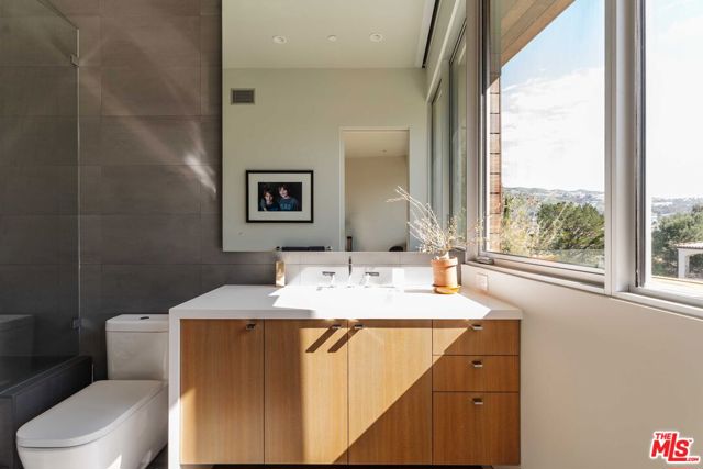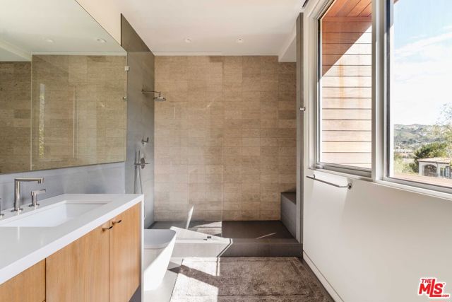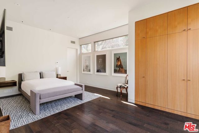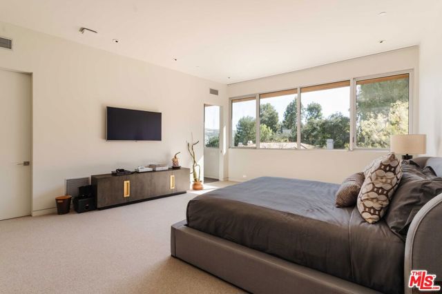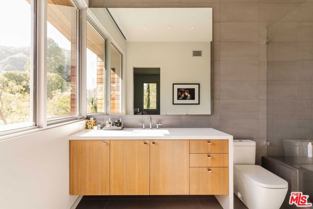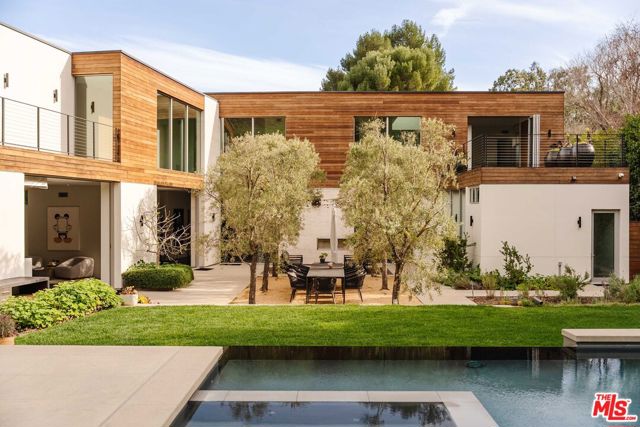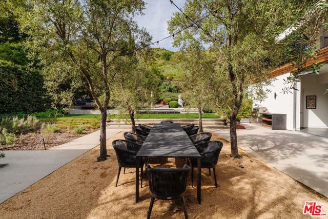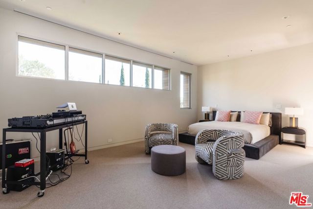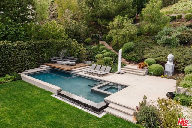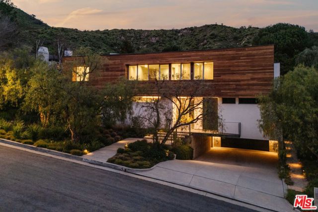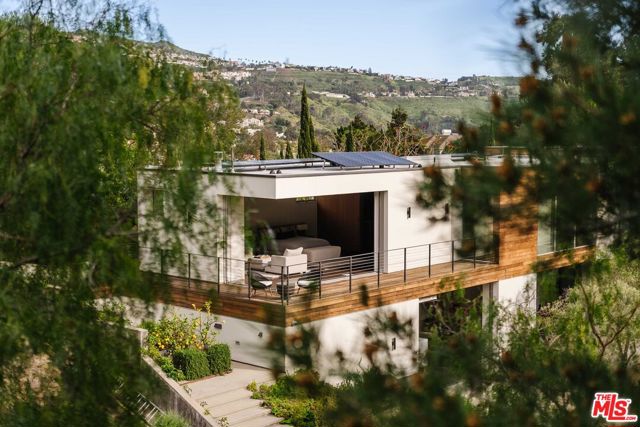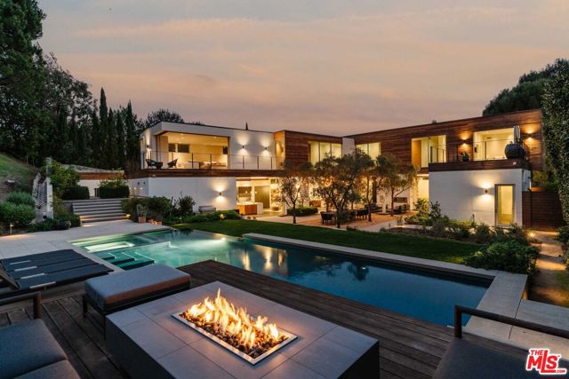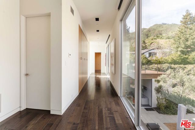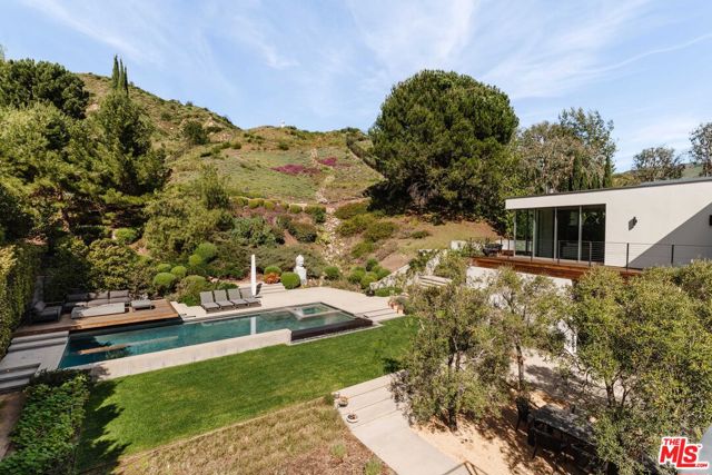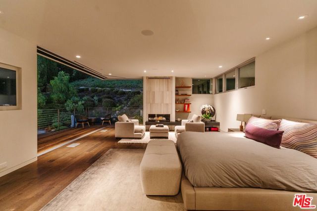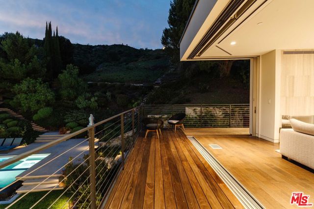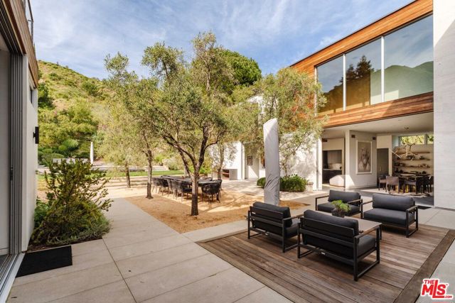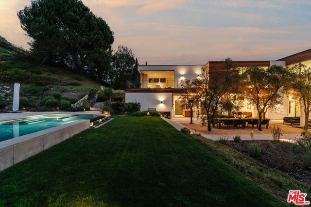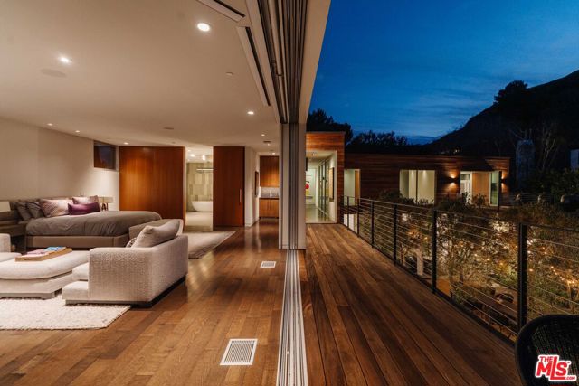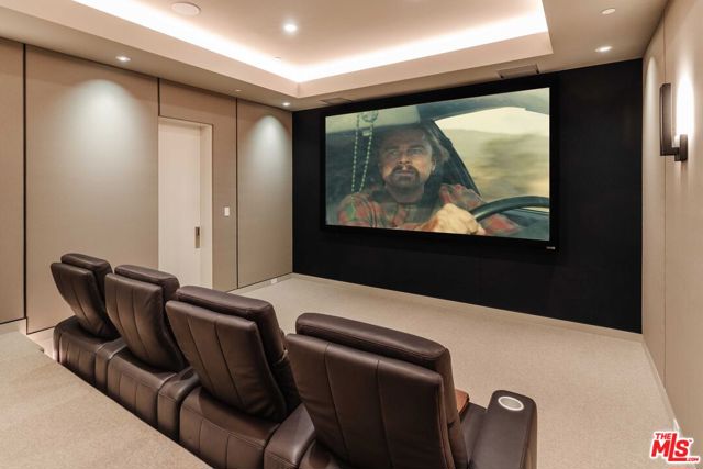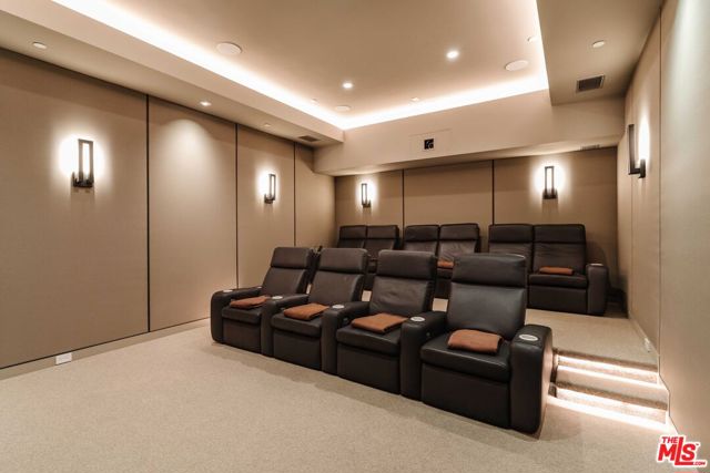Rarely does a home of this distinction come to market. Situated within the coveted, 24-hour guard-gated enclave of The Palisades Country Estates, this warm-modern sanctuary was custom-conceived by the owners in 2018 as their private residence. Sparing no expense, every square foot was meticulously curated to create a bespoke architectural masterpiece that balances grand-scale entertaining with intimate, everyday luxury.The journey begins at a massive pivot door, opening to an impressive main living space defined by 11-foot ceilings and smooth concrete floors. The living room is anchored by a stunning fireplace with a reeded travertine hearth, complemented by a wet bar and a handmade floating metal-and-glass staircase. Beyond the formal dining room, flanked by gallery walls and custom built-ins, is the chef's kitchen. This culinary center features a massive island, custom cabinetry, and a professional-tier appliance suite by Wolf, Miele, and Sub-Zero. Exceptional utility is provided via a walk-in pantry, a butler's pantry, and dedicated wine storage. The main level's common rooms seamlessly transition outdoors through floor-to-ceiling sliding glass pocket doors, blurring the lines between the interior and the landscape. This level also includes a versatile bedroom suite (currently utilized as an office), two elegant powder rooms, and a world-class cinema. The 10-stadium-seat theater is a feat of engineering, featuring a 4K projector, Dolby surround sound, and a structure designed to literally "float" above the foundation for peak acoustic isolation.Retreat upstairs via the front floating staircase or the discreet rear stairs to find four expansive bedroom suites. The primary wing is a masterclass in design; a dedicated hallway leads to the bedroom where walls of glass meet at the corner and pocket away, inviting the backyard views inside. This sanctuary is replete with a fireplace, wet bar, and specialized interior/exterior blackout shades for an optimized sleep environment. The spa-inspired bath offers an open-concept double rainfall shower, a standalone soaking tub, heated floors, and dual oversized walk-in closets.Resting on nearly an acre, the resort-style backyard features multiple lounge areas, a picturesque alfresco dining space framed by olive trees, a pool and spa complemented by a cantilevered firepit deck, and a top-tier Wolf/Lynx BBQ station. A private trail winds up the hillside to an upper viewing deck tucked within mature landscaping.The home's functional "brain" is equally impressive, featuring whole-house Crestron automation, multi-zone HVAC with HEPA filtration, and a whole-house water softening and filtration system. Energy efficiency is paramount, powered by 44 solar panels to multiple Tesla Powerwalls. The residence is completed by a gym, a large laundry room, an oversized 2-car garage with EV charging, 2-car covered car port, and expansive subterranean storage. In addition to 24/7 guards and mobile patrols within The Palisades Country Estates, the house itself benefits from a dedicated state-of-the-art security system linked directly to a 24/7 control center, ensuring unparalleled peace of mind.Perfectly positioned just up the hill from the Pacific Coast Highway, this private estate offers a lifestyle of serenity and convenience, with easy access to Palisades Village, Malibu, and the Westside.