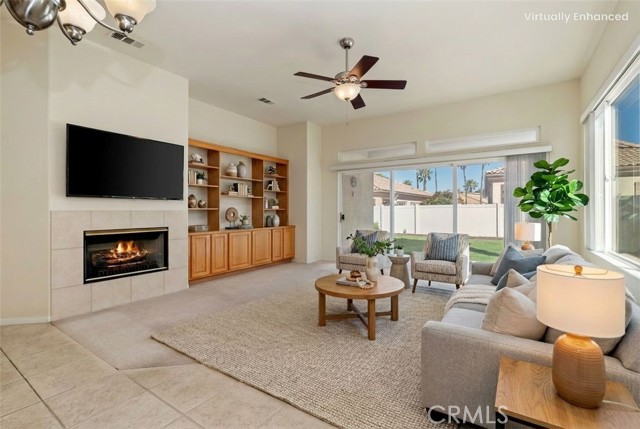 Welcome to 5909 Indian Canyon Drive, located in the highly sought-after Sun Lakes Country Club, a premier 55+ gated community offering resort-style living in the foothills of Banning. PAID OFF SOLAR, best value for this popular floorplan. This well-designed single-story home features an inviting open-concept layout with a spacious great room that serves as the heart of the home. High ceilings and large windows create a bright, airy atmosphere while the fireplace and built-in entertainment area add warmth and character. The kitchen offers generous workspace, abundant cabinetry, and convenient storage features that make both everyday cooking and entertaining easy. Adjacent dining and living areas provide a comfortable setting for gatherings with family and friends. The home includes two bedrooms plus a versatile den that can function as a home office, reading room, or hobby space. The primary suite is especially spacious and includes an oversized walk-in closet and a relaxing ensuite bath designed for comfort and convenience. Step outside to a covered patio overlooking the landscaped backyard, offering a peaceful space to enjoy morning coffee or evening sunsets. The yard includes several mature fruit trees and garden areas, adding charm and a touch of nature to the property. Residents of Sun Lakes Country Club enjoy an exceptional array of amenities including two golf courses, multiple clubhouses, pools and spas, fitness facilities, tennis and bocce courts, dining venues, and countless social clubs and activities. With scenic mountain surroundings and a vibrant community atmosphere, this home offers the perfect blend of comfort and active lifestyle living.