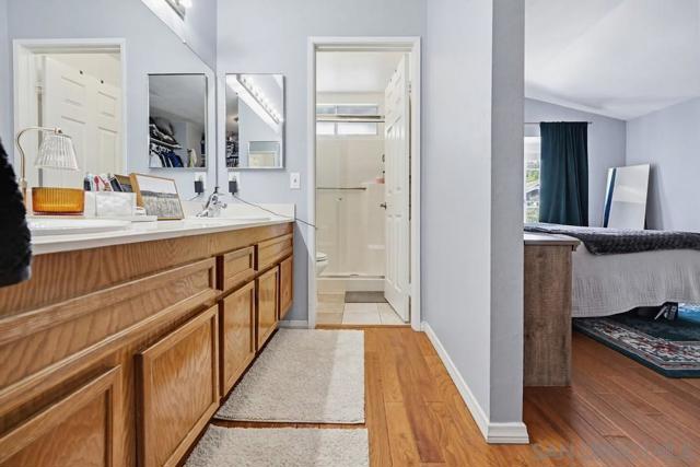 Welcome to this beautifully maintained home tucked away on a quiet cul-de-sac in the desirable Hillsborough community of Paradise Hills. Light, bright & thoughtfully designed, this residence offers 3 bedrooms, 2.5 bathrooms & a 2-car garage with extensive built-in storage cabinets. The inviting living room features soaring vaulted ceilings & a cozy fireplace, creating an open & welcoming atmosphere filled with natural light. The updated kitchen combines style & function with granite countertops, custom tile backsplash, white cabinetry, stainless steel appliances, recessed lighting & a convenient eat-at bar. Wood-look tile flooring, wood floors & classic 6-panel doors add warmth and character throughout the home. A versatile flex space & bedroom on the first floor provide ideal options for guests, a home office, or multi-generational living. Upstairs, the spacious primary suite offers vaulted ceilings, mountain views, a walk-in closet & private en-suite bath featuring dual sinks & a walk-in shower with built-in seating. Step outside to the backyard designed for relaxing and entertaining, complete with stamped concrete, a covered patio & a fully fenced yard. The front yard offers low-maintenance landscaping with garden plants for easy upkeep. Additional upgrades include newer slider, new water heater, new outside paint, ceiling fans throughout, garage door opener & abundant storage in the garage. Residents enjoy access to the Hillsborough HOA amenities including two community pools, spa, tennis courts, playground, clubhouse & open grassy areas perfect for outdoor activities.