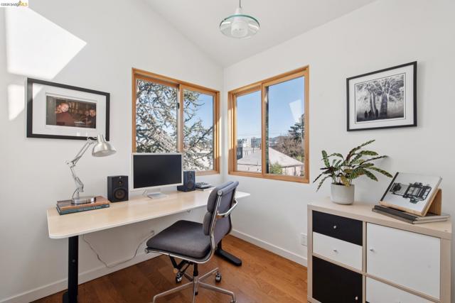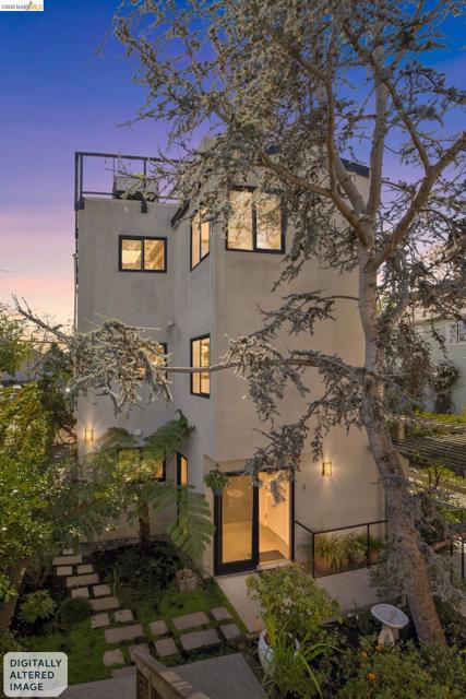 Extraordinary offering. This special property is ideal for multi-generational living, shared housing, or house hacking. Impressive single-family home at the front and a charming income-generating duplex at the back. A lovely courtyard with gardens and a small stage for live music or events separates the two buildings. The main house offers convenient living with an elevator connecting all three floors, newer windows and roof, and immaculate artistic interiors. On the lower level, there's a full bedroom and bath—perfect for a private suite or home office. The second floor includes two large bedrooms, an office, and a bathroom. On the top level, you'll find a bright living room, dining area, newly renovated chef’s kitchen with a Bertazzoni range, and another office. The rooftop deck provides panoramic views of the hills and Bay Bridge, privacy, and a plumbed gas grill for year-round enjoyment. The duplex has upper and lower units, each with two bedrooms, one bath, updated kitchens, new electrical systems, and windows. W/D in each unit, all appliances included. Both flats have functional layouts with charming details. Conveniently walk to nearby cafes, parks, and shops, and abundant off-street parking. Income from the duplex can help make this exceptional home your own!