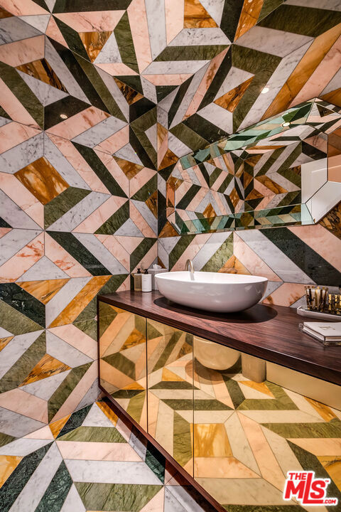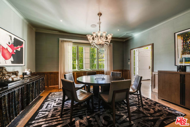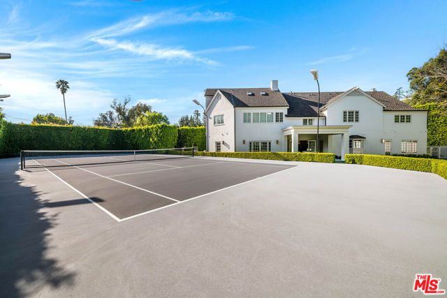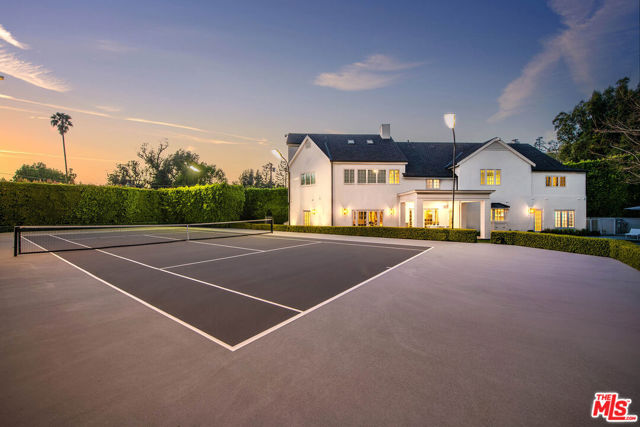 Situated within the prestigious guard-gated enclave of Hidden Valley Estates, surrounded by the homes of Hollywood's most notable residents, this stately East Coast-inspired traditional estate is a true jewel - thoughtfully reimagined to blend timeless architecture with refined modern comforts. Privately walled and gated, the residence offers exceptional seclusion and a pristine, elegant facade that sets a distinguished tone upon arrival. A gated driveway leads to a two-car garage, while a beautifully landscaped gated front courtyard creates a gracious and welcoming approach. The interiors reveal meticulous craftsmanship throughout, where imported stone, rich wood detailing, and contemporary lighting create a warm yet sophisticated atmosphere. A full-house Sonos sound system provides seamless audio throughout the residence, enhancing both everyday living and entertaining. The designer kitchen is a true culinary showpiece, appointed with burnished brass fixtures, striking forest-green marble, and a magnificent Officine Gullo cooking range as its centerpiece. The formal living room exudes character and refinement, featuring a dramatic stone fireplace, coffered wood ceilings, and custom steel-and-glass architectural accents. Expansive glass doors allow the family and dining rooms to flow seamlessly outdoors, creating effortless indoor-outdoor living. The grounds have recently undergone a complete redesign with newly refreshed landscaping, creating an immaculate outdoor setting. The backyard offers a sparkling pool and spa, generous lawn, al fresco dining areas, and a full outdoor kitchen complete with built-in barbecue, sink, and wine refrigerator, perfect for entertaining. One of the estate's most notable amenities is the recently renovated championship tennis court with lights, providing a beautifully upgraded setting for both daytime and evening play. Upstairs, the expansive primary suite serves as a tranquil retreat with a fireplace, lounge area, spa-inspired marble bath with soaking tub and shower, and an impressive dual closet and dressing room. Two additional bedrooms occupy the second level, while the third floor features a dedicated gym or additional bedroom suite. Additional amenities include intimate lounge and seating areas throughout and private access to the scenic hiking trails of nearby Franklin Canyon Park, offering a rare combination of privacy, elegance, and natural beauty in one of Los Angeles's most coveted communities.