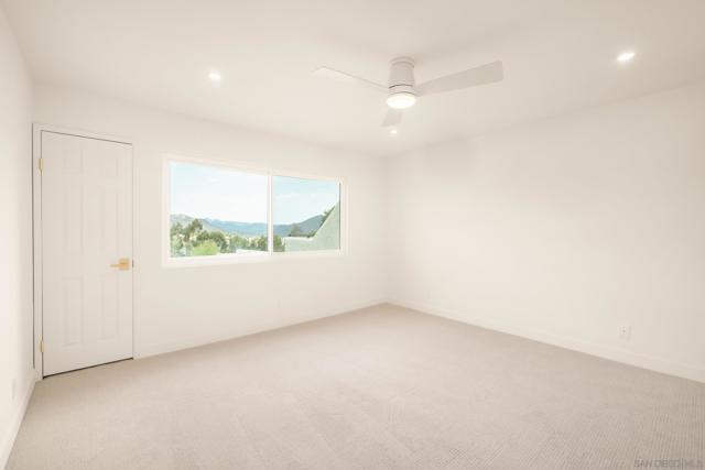 FHA & VA Approved Complex! Enjoy fantastic views of the mountains and Lake Hodges from this beautifully updated upstairs corner unit, filled with natural light and vaulted ceilings in the living room. This stylish home features brand-new white oak cabinetry, quartz countertops, and a fully refreshed bathroom for modern comfort. The spacious primary bedroom offers a huge walk-in closet plus an additional closet for plenty of storage. New dual-pane windows throughout, plush new carpeting, and a newer central HVAC system provide year-round comfort. A stacked washer and dryer are conveniently located in the hallway closet. Unit comes with one covered carport and one assigned open space just outside the unit, along with ample guest parking. Don’t miss this move-in-ready gem with serene views and quality upgrades!