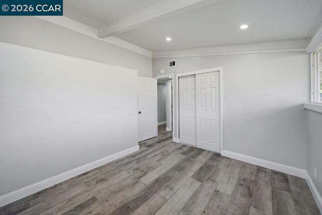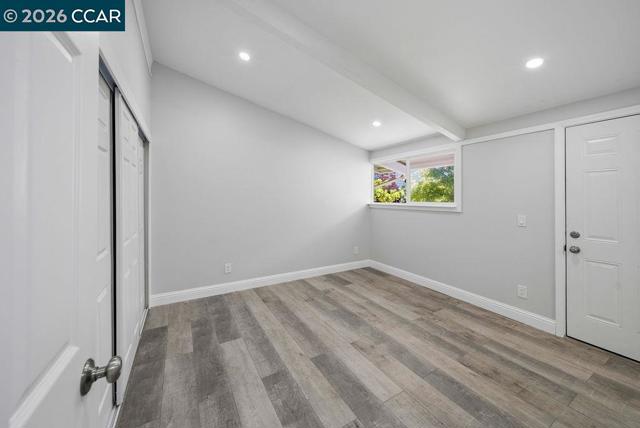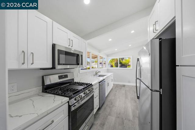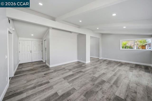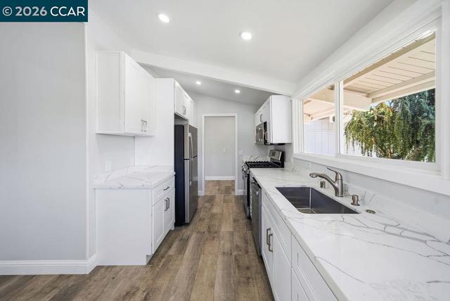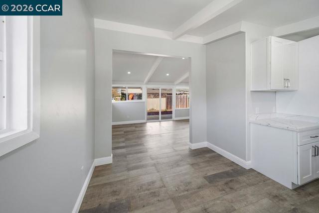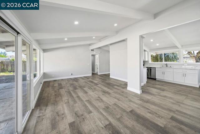 Beautifully updated single-story home on a corner lot! Walk into a bright and open layout. The updated kitchen features white shaker cabinetry, granite countertops, stainless steel appliances, and a gas range stove. Vaulted beam ceilings, recessed lighting, and expansive windows fill the home with natural light and create an airy, welcoming atmosphere throughout. The living space opens to the backyard through sliding glass doors, creating easy indoor-outdoor living ideal for relaxing or entertaining. Both bathrooms feature updated vanities, while the bedrooms provide comfortable and functional living spaces with the primary having direct access to the backyard. Updated engineered wood flooring and fresh interior paint complete the home’s bright, refreshed interior. Outside, the backyard offers a patio area ideal for relaxing while leaving room to add your own personal touches.The property also features a two-car garage and a spacious driveway. With thoughtful updates throughout and excellent natural light, this move-in ready home blends comfort, style, and functionality.