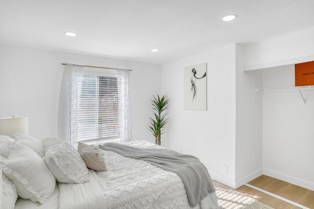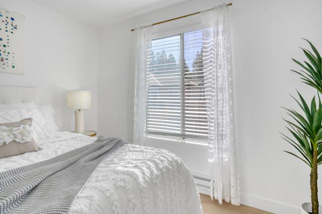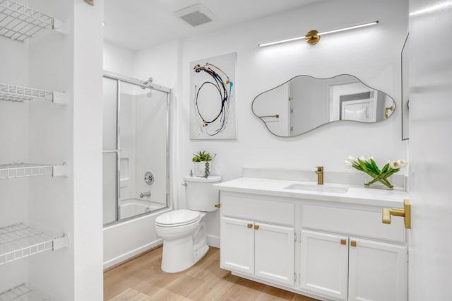 Rare townhouse-style condo in the desirable Crescendo community, ideally positioned on a quiet interior corner with open views and abundant natural light. This upper-level 1-bedroom, 1-bath home offers uncommon privacy with no neighbors above or below, plus an attached garage with a dedicated storage room and built-in shelving. The community also offers ample additional and guest parking throughout, a rare and convenient feature for the area. The open living and dining area connects seamlessly to an oversized private patio through dramatic floor-to-ceiling glass doors, creating an exceptional indoor-outdoor space rarely found in a condo. Open, airy, and well-separated from neighboring buildings, the setting feels bright and inviting. Recent updates include new flooring, fresh interior paint, white quartz countertops, light gold fixtures, modern lighting, and in-unit washer and dryer. Residents enjoy resort-style amenities including a pool, spa, and beautifully landscaped grounds. Prime North San Jose location near major employers including Nvidia and Cisco, as well as Rivermark, Levis Stadium, Light Rail, and convenient freeway access.