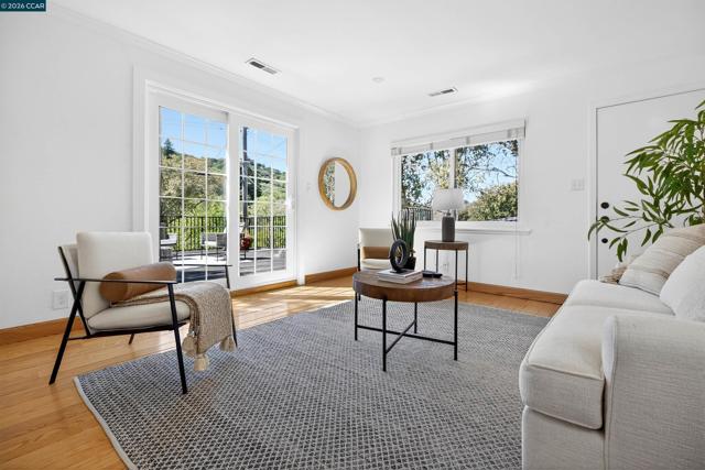 Tucked away on a peaceful cul-de-sac, yet just minutes to town and BART, 27 Glorietta Ct embodies all the allure of early mid-century design combined with modern amenities. The open living and dining area has a wall of windows and glass French doors leading to the inviting patio and gardens. The kitchen is a chef’s delight, with stone countertops and stainless steel appliances including Thermador gas range.Enjoy family meals in the sunny breakfast nook with bay window. The main bedroom wing includes three generous bedrooms and beautifully updated hall bathroom with separate tub and shower. Fabulous primary suite offers wide picture windows with pastoral views and luxurious spa-like bathroom. Spacious family room opens to expansive sun-drenched deck. In the same wing, the versatile floor plan offers 4th bedroom and tastefully updated bathroom, as well as bright laundry room. Additional features include hardwood flooring throughout, dual pane windows, updated 2-car garage with epoxy floor coating and storage. The yard has room to roam and includes a delightful shaded patio and raised vegetable beds, ready for spring planting. 27 Glorietta Court is an unparalleled oasis of serenity, a home base from which to enjoy all that Orinda offers.
