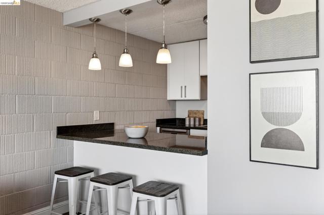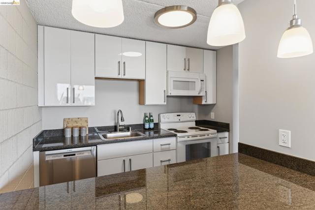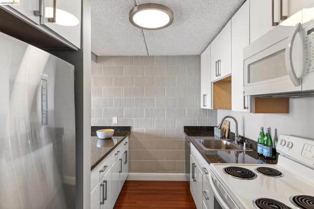 This location is ideal for those seeking to live near Piedmont Avenue, with its restaurants, gourmet grocery stores, coffee houses, boutiques, salons, a first-run movie theater and a famous ice cream parlor. The west facing floor to ceiling glass walls capture the magnificent views of San Francisco, the Golden Gate Bridge and Mount Tamalpais. Wood flooring flows throughout and the bathroom countertop features stunning green glass. The updated kitchen features a granite counter breakfast bar where friends can gather to chat as the host produces sumptuous meals. Outdoors, the balcony runs the full width of the condo and is a perfect place to relax at sunset while nature puts on a show for you and your guests. The transportation options abound near BART, AC Transit and close to Highway 580. It also includes a secured garage parking space as well as a storage unit. Guest parking is available near the entry. A large, light and airy laundry facility with a multitude of washers and dryers, makes doing the laundry pleasurable. Entertain large parties in the separate facility at the front of the building. Kelton Court is a quiet cul-de-sac, and unit 2D could be your primary home, or your pied-à-terre. Views: Downtown