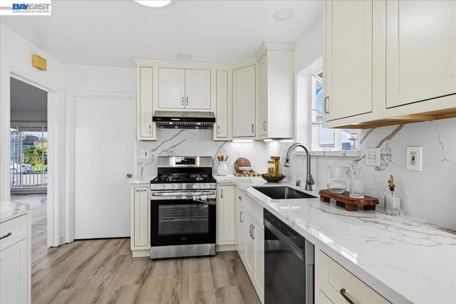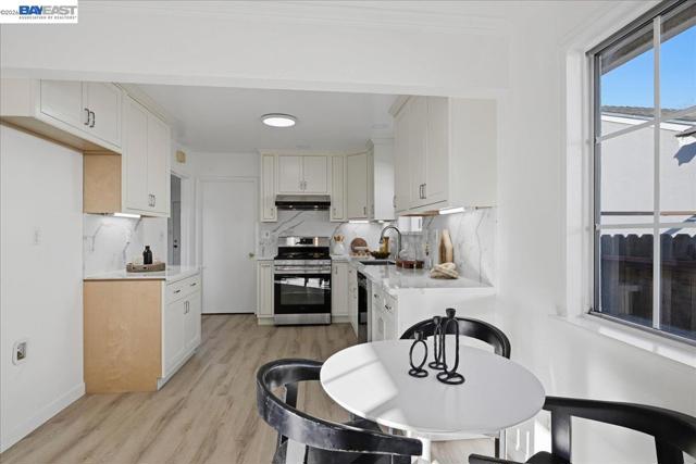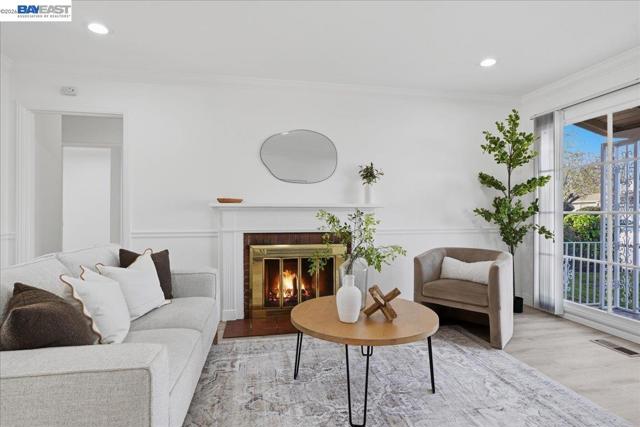Charming home featuring a newly remodeled kitchen and bathroom with stylish solid surface countertops, new cabinetry, and stainless steel appliances. The home offers new luxury vinyl plank flooring throughout, creating a modern and cohesive feel with LED lighting. The kitchen includes a free-standing gas range, dishwasher, and a comfortable eat-in dining area, opening to a family/kitchen combination room ideal for everyday living and entertaining. The inviting living room features a fireplace for added warmth and character. The beautifully updated bathroom includes solid surface finishes, a tub with shower, a smart toilet, and a powered mirror for a contemporary touch. An additional second full bathroom is conveniently located in the garage. Outside, enjoy clean and well-maintained front and back yards with fresh mulch, offering space to relax, garden, or entertain. The property also includes two storage sheds, providing plenty of extra storage.