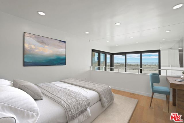 OCEANFRONT SOUTH CORNER, FULLY RENOVATED - Designer perfect condo with tremendous light all day! Gorgeous living room space with soaring 2-story ceilings, walls of glass where the ocean, blue skies and sand surrounds you, oak hardwood floors throughout, + an enormous private Ipe wood Oceanfront deck (outdoor living room) perfect for entertaining. The spacious contemporary kitchen is stunning with custom cabinetry, caesarstone countertops, Fisher & Paykel, Bosch stainless appliances, open to the dining and living room areas. The primary bedroom/loft has direct ocean and Channel views with an exquisite ensuite master bathroom complete with an oversized walk-in shower, dual vanity with head on ocean views. The second bedroom is separate and private with a beautifully done bathroom. Additionally, there is in unit laundry, parking for two cars plus additional storage in the garage. Move in and enjoy oceanfront living at its finest! Walking distance to the main Channel, the canals, plentiful farmers markets, excellent restaurants, shopping, and easy bike ride to Abbot Kinney shops and restaurants and all the Marina Del Rey Peninsula neighborhood has to offer.