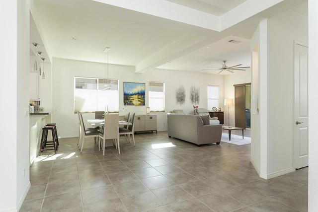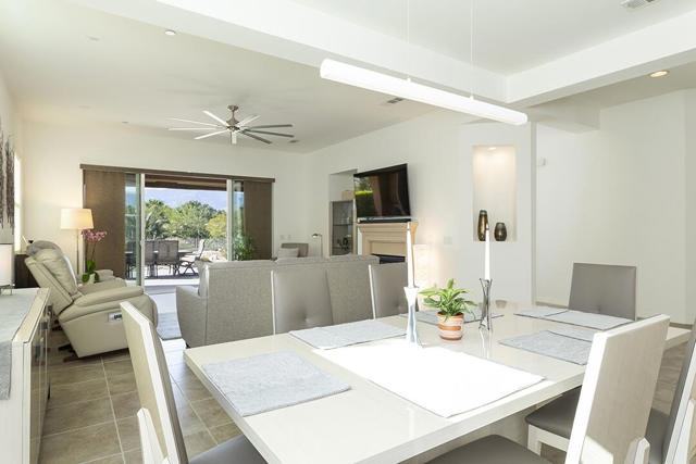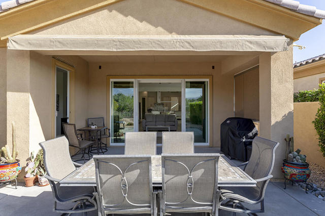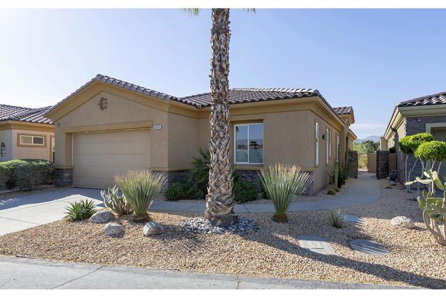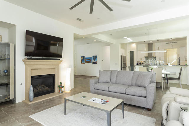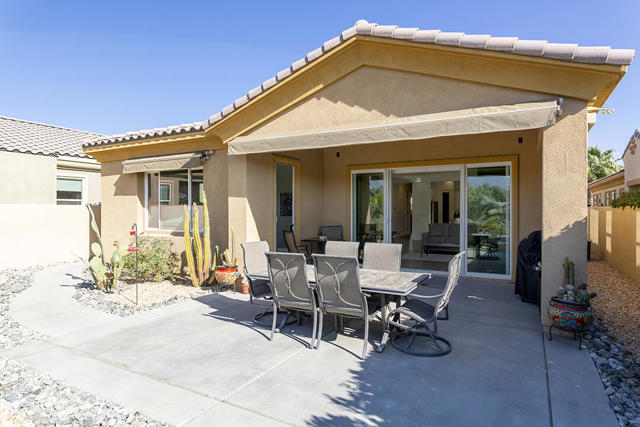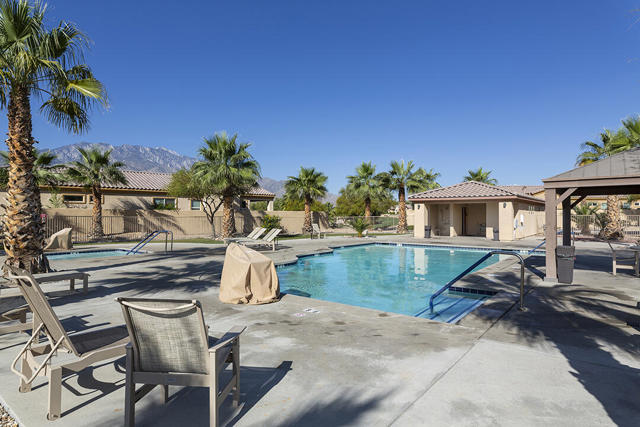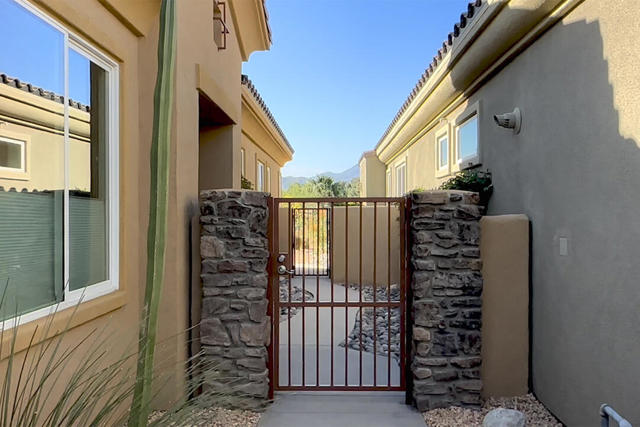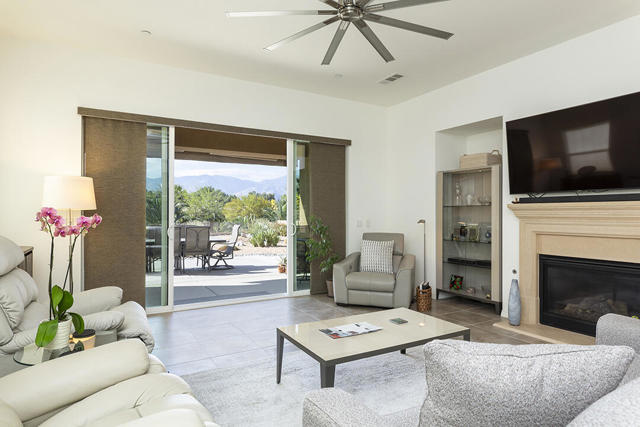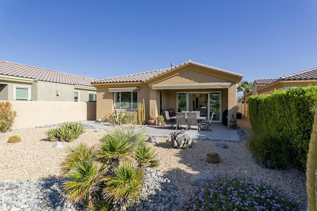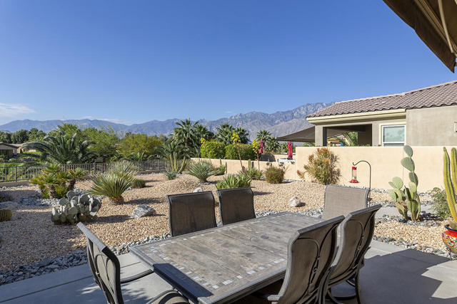 This beautiful Desert Princess home on fee land (land you own) offers the ideal combination of privacy and resort-style living. The showstopper is the spectacular mountain view, best enjoyed from the living room, primary bedroom, or while relaxing under the covered rear patio just off the living room and primary suite. The staggered lots of the neighboring homes, along with the southwest-facing backyard, provide privacy and protection from the desert's wind on its breeziest days.Just beyond the backyard are the Arroyos walking trails, offering nearly four miles of paths through native desert landscaping. Directly across the street is one of the community's largest pools, giving you convenient access without the expense or maintenance of a private pool. The Desert Princess community also features 35 pools and spas, a 27-hole HOA-owned golf course, tennis and pickleball courts, a fitness center, a restaurant, a full-service spa, and a 24/7 guard-gated entrance, creating a true resort environment.Inside, the home offers an expansive open floor plan with a central dining area, chef's kitchen, and an inviting living room with a gas fireplace and sliding door access to the backyard patio. The open kitchen with a dine-in island features quartz countertops, a custom tile backsplash, stainless steel appliances, and a large pantry. Just beyond the kitchen is a laundry room with direct access to the attached two-car garage.The primary suite, with a doorway to the rear patio, enjoys a large picture window framing the mountain views. The spa-like primary bath includes a soaking tub, a separate shower, a double vanity, and a spacious walk-in closet. This Arroyos Villa 2 floor plan also offers two additional bedrooms at the front of the home for added privacy, sharing a Jack-and-Jill bath, along with a convenient guest half-bath in the hallway. From the tile flooring throughout to the contemporary cabinetry and updated finishes, every element of this home feels clean, refined, and move-in ready.Solar | Owned Solar | 22 panels | 7.6 KwHOA | $995/mo - includes 2 DVR or HD cable boxes and service, high-speed Internet, grounds maintained to your door by the HOA ground maintenance crew, outside pest control when requested, and outside water. 24-hour guard gate access, membership to the health and fitness center, which includes access to tennis, bocce ball, and pickleball. Discounts and preferred tee times at the PGA championship golf course, and no initiation fee.
