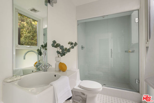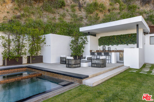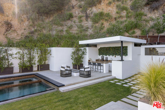 Perched on a private hillside above the city, this striking modern architectural residence captures sweeping panoramic views of the Downtown Los Angeles skyline while offering exceptional privacy and seamless indoor-outdoor living. Set behind a gated motor court and surrounded by lush landscaping, the home showcases clean contemporary lines, expansive walls of glass, and multiple terraces that frame the breathtaking city vistas. The open-concept living spaces flow effortlessly to outdoor decks and lounge areas, creating an ideal setting for both everyday living and entertaining. The resort-inspired grounds are the centerpiece of the property, featuring a dramatic infinity-edge pool and spa, sun deck, and rare flat grassy lawn overlooking the city lights. A separate pavilion complete with a covered lounge, outdoor bar, and entertaining terrace, brings that outdoor lifestyle together. Thoughtfully designed outdoor spaces throughout the property create a true hillside retreat, with multiple seating areas, landscaped pathways, and unobstructed skyline views.Offering rare privacy just minutes from the Sunset Strip's world-class dining, nightlife, and entertainment, this architectural hillside sanctuary delivers a quintessential Los Angeles indoor-outdoor lifestyle.