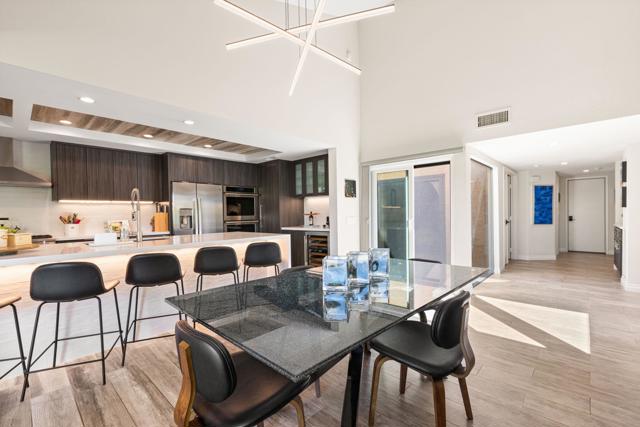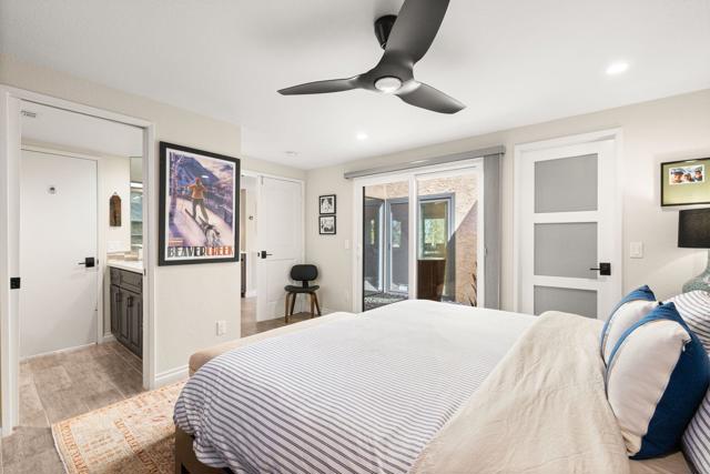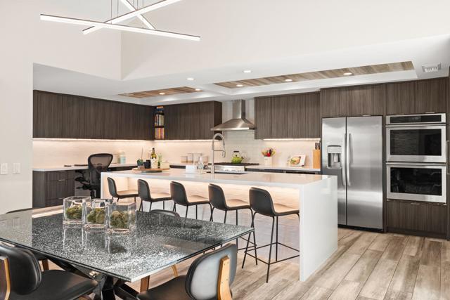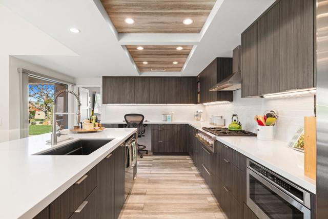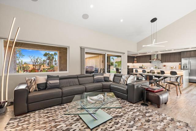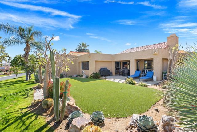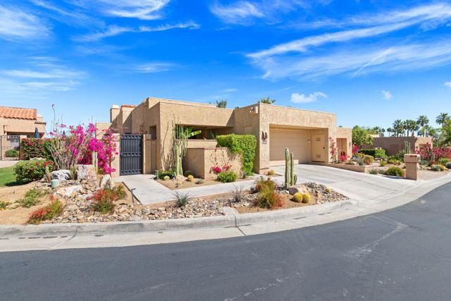 Beautifully remodeled and expanded to include 3-bedrooms and 2-baths. Located on elevated site of a private cul-de-sac street. Tile flooring throughout. Glass windows and sliders were replaced in 2024. The Upgraded and redesigned kitchen is open to dining room / living room area with fireplace. Silestone counters, custom cabinetry GE Profile refrigerator, SubZero wine fridge, GE Monogram double ovens, and 6-burner gas stovetop. Bedrooms and baths are also updated. with Tile showers. Main bedroom has custom shade structure installed on the private patio. LED lighting, smart switches and kitchen under cabinet lighting, Double attached garage with laundry, storage cabinets ad epoxy floor. Gas BBQ on patio area. The yard area has been extended and professionally landscaped to enhance the outdoor experience. 20-owned Solar Panels and new main electrical panel. This home is move-in ready in a private view setting located near 2-HOA pools/spas. Ironwood memberships are available for golf, tennis, fitness & dining.