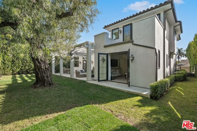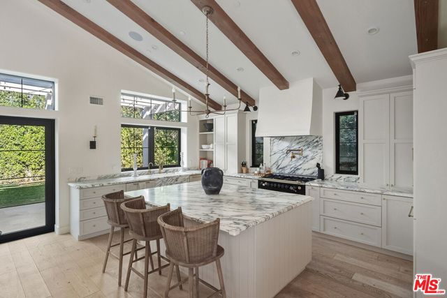 Nestled in Brentwood, this Spanish-style residence evokes timeless sophistication -- an architectural gem with interiors worthy of the pages of a design magazine. Classic rustic charm meets modern refinement throughout, with soaring beamed ceilings, wide plank oak floors, graceful archways, and an abundance of natural light streaming through oversized windows. A dramatic double-height entry sets the tone, opening to an expansive great room crowned with beams and framed by a wall of French doors that invite effortless indoor-outdoor living. Carefully curated lighting and integrated surround sound create an inviting ambiance to elevate every moment. The space flows seamlessly from the living area, anchored by a striking floor-to-ceiling fireplace, to a dining nook with built-in banquet seating and onward to the showpiece kitchen. The gourmet kitchen is as beautiful as it is functional, featuring natural stone surfaces, custom cabinetry, and gleaming brass fixtures that feel like jewelry. A substantial center island with bar seating serves as the heart of the home, while a premium ILVE double oven range with a custom hood brings culinary ambitions to life. Just down the hall, a versatile den offers possibilities for a variety of lifestyles, ideal for use as a home office, media lounge, gym, or playroom. The main-level primary suite is a serene retreat, opening through French doors to the lush backyard. Indulge in a spa-inspired en suite bath with dual stone-topped vanities, a glass-enclosed tiled shower, and a generous walk-in closet with custom organization. Upstairs, three spacious secondary bedrooms await, including two with private balconies. A beautifully appointed shared bath features dual vanities and a shower-tub combination. Outside, the fenced backyard lives like a private oasis, enclosed by mature hedging and offering a grass lawn alongside an expansive pergola-shaded patio for lounging, dining al fresco, or enjoying game-day gatherings. Additional highlights include a stylish powder room, a fully outfitted laundry room, and an attached two-car garage with direct home access. Supremely located with convenient access to the best of Brentwood's amenities and top-rated schools. Popular boutiques and renowned restaurants are just moments away in Brentwood Village and along San Vicente Blvd, while the beach is just a few minutes' drive. This exceptional residence embodies the romance of the Spanish-style with the ease of modern luxury in one of the Westside's most desirable neighborhoods.