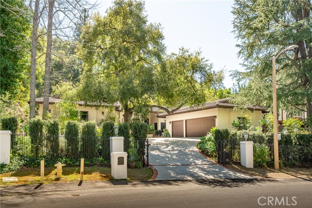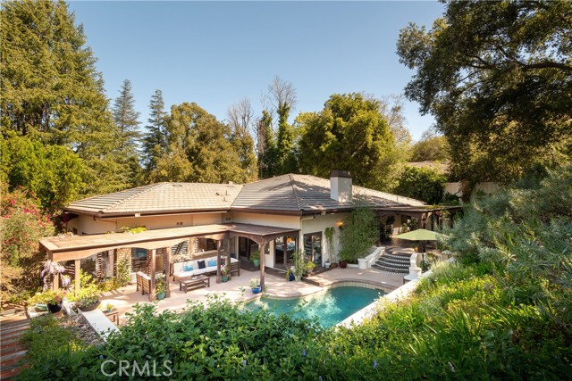 Located in the prestigious Westlake Trails community, this gated single-story estate offers exceptional privacy and timeless character in one of Westlake Village’s most coveted enclaves. Set against the scenic Santa Monica Mountains and just moments from Westlake Lake and The Landing, top-rated restaurants, shopping, and hiking trails, the property blends convenience with the tranquility of a secluded natural setting. Designed with Spanish-inspired architecture and high-end finishes, the residence features travertine flooring, rich hardwood floors, and custom wood doors throughout. The chef’s kitchen is equipped with premium Viking appliances, generous counter space, and a functional layout ideal for entertaining. Large windows frame beautiful views of the lush, mature landscaping and Pebble Tec pool, creating a seamless indoor-outdoor connection and filling the space with natural light. The home’s thoughtfully designed layout includes a private bedroom wing with guest suites and a luxurious primary suite retreat. The spacious primary suite features its own secluded patio and a spa-like bathroom complete with a fireplace, dual vanities, soaking tub, walk-in shower, and large his-and-hers closets. The resort backyard offers multiple patios and entertaining spaces surrounded by mature oak trees and natural greenery, providing a peaceful and private outdoor setting. The Pebble Tec pool is perfectly positioned within the landscape to create a tranquil retreat. Perched above the property is a detached guest house with a kitchenette and full bath, ideal for guests, a home office, gym, or private studio. This is simply a rare opportunity to own a gated luxury estate with a guest house, pool, and single-story living lifestyle in one of Westlake Village’s most desirable communities, Westlake Trails.