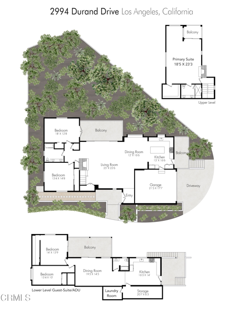 Perched in Beachwood Canyon with breathtaking city views, 2994 Durand Drive has been renovated with the utmost care and attention to detail. Featuring a 3-bedroom 2-bathroom main home, and a lower-level 2-bedroom 1-bath ADU/guest-suite, with multiple balconies and covered patios. Inside, the main living area is bathed in natural light, with striking Downtown views from nearly every room, showcased through steel windows and doors throughout. Steel sliding patio doors open out to a spacious balcony perfect for al-fresco dining. The open kitchen features an island and plenty of cabinetry, including a floor-to-ceiling pantry cabinet. The two-car garage has direct access into the home. Two bedrooms occupy the main level and share a full hallway bath, complete with tub/shower combo and dual sink vanities. A laundry closet and storage closet complete this level. Upstairs, the primary suite has a fireplace, walk-in closet, reading nook, luxurious bathroom with walk-in shower with two shower heads, dual-sink vanities, and a private balcony perfect for stargazing or enjoying a morning coffee. Downstairs, a separate 2-bedroom 1-bathroom guest suite/ADU with its own entrance, features a spacious, open floor-plan with a kitchen, living room which opens out to a private balcony. A spacious laundry room off the kitchen offers lots of storage space. Additional features: oversized 1-car garage, driveway parking and street parking directly in front of the home. This property presents a unique opportunity for a variety of living arrangements, and is just up the hill from Beachwood Village, minutes from Lazy Acres Market, and numerous hiking trails.