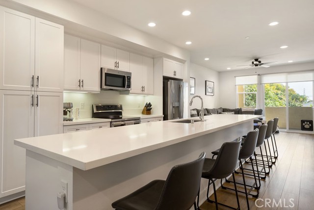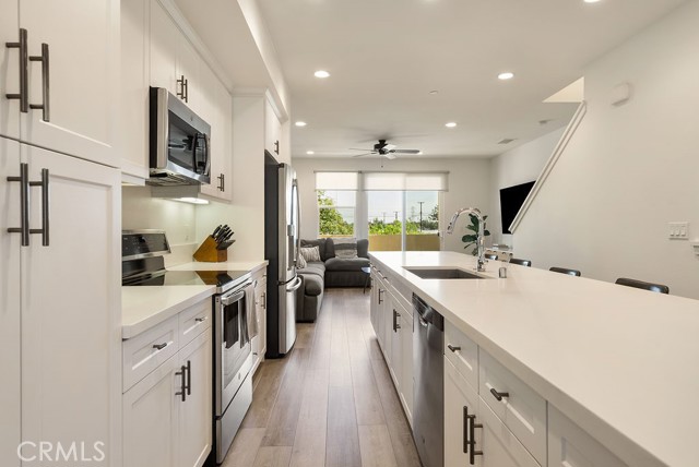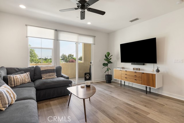 Welcome to 7686 Sunflower Dr, a modern & move in ready 2 bedroom, 2.5 bath front facing townhome built in 2018. This contemporary tri-level residence offers the perfect blend of style, efficiency & low-maintenance living. Thoughtfully designed, the home features an open-concept living area filled w/ abundant natural light, custom window treatments & a spacious kitchen complete w/ quartz countertops, stainless steel GE appliances & an oversized center island, ideal for entertaining or everyday living. The seamless flow between the kitchen, dining & living areas creates a bright & inviting atmosphere. Upstairs, you’ll find two primary bedrooms, both w/ en-suite bathrooms & walk in closets. The larger suite offers an oversized bathroom w/ a spacious shower, while the second bathroom includes a tub. Additional highlights include a paid off solar panel system for energy efficiency & reduced utility costs, an attached 2-car tandem garage w/ direct access & extra storage, outdoor balcony off the living room, indoor laundry w/ a newer stackable washer/dryer, custom vinyl flooring throughout & newer carpet on the stairs. This stylish home offers modern comfort, thoughtful upgrades & convenient living in a desirable Pico Rivera location.