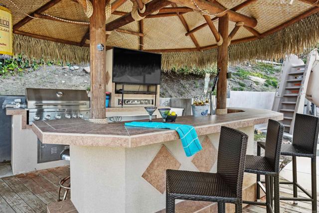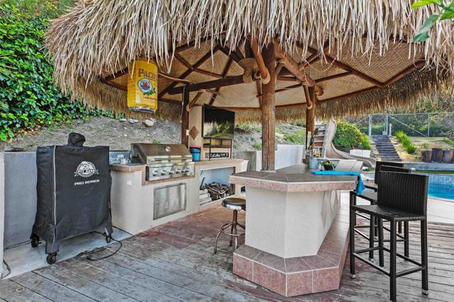 Experience resort-style living in this spacious single-story, 4-bedroom, 3-bathroom home located in a highly sought-after Poway neighborhood. Situated on nearly a quarter-acre lot, this property offers an expansive feel with breathtaking mountain views and a backyard designed for ultimate entertainment. Enjoy peace of mind with significant recent updates. Within the last five years, the HVAC system, tankless water heater, and kitchen have all been tastefully replaced and upgraded. The home is designed for energy efficiency and year-round comfort, featuring: owned solar, dual-paned window throughout, a whole house fan and enclosed sunroom- perfect for a home office, gym, or playroom The backyard is a true private oasis, meticulously designed to be the "coolest" spot in the neighborhood:The outdoor kitchen features a beautifully constructed 15-foot palapa, custom bar, and built-in grill. The salt water pool includes a 'Shamu' baja shelf with an umbrella holder and a massive slide for endless summer fun, complemented by an above-ground spa. Harvest your own fruit from mature lemon, lime, grapefruit, and fig trees. The converted garage offers flexible space for a guest suite, hobby room, or additional living area with a full bathroom nearby Located within the boundaries of the award-winning Poway Unified School District, you are minutes away from premier shopping, dining, and easy freeway access. Whether you’re hosting a summer BBQ under the palapa or enjoying the quiet mountain vistas, this home offers an unparalleled lifestyle.