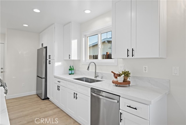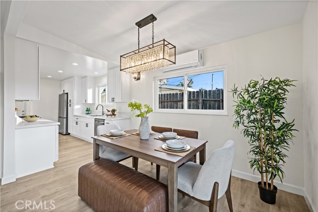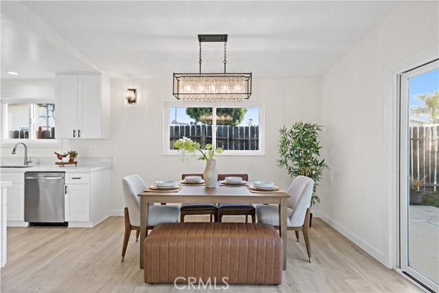 Single-story 4-bedroom, 2-bath home situated on a 6,209 sq. ft. lot with extensive recent upgrades throughout. The interior features an open concept dining and living room area with vaulted ceilings, recessed lighting, a cozy fireplace, and sliding glass door access to the backyard. Recent upgrades include a completely remodeled kitchen with quartz countertops, kitchen sink, shaker-style cabinetry, new stainless-steel appliances, open flow to the dining area, and garage access for a washer and dryer. Both bathrooms were upgraded with a new bathtub or shower stall, commodes, and sinks. With new laminate flooring, new interior and exterior paint, and lighting fixtures throughout this home is move-in ready. Major system upgrades include a new roof, a 200-amp electrical panel, water heater, and a ductless heating and cooling system. The exterior features an extended driveway leading to a 2-car attached garage with direct access, a fenced backyard with a grass area and concrete patio. This property is located in a residential area close to parks, schools, shopping, dining and freeway connections.