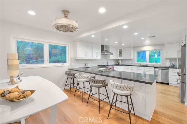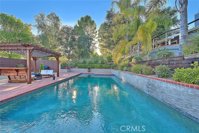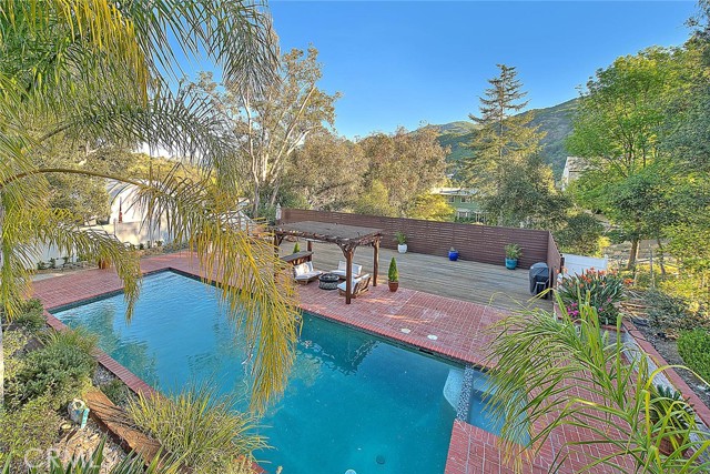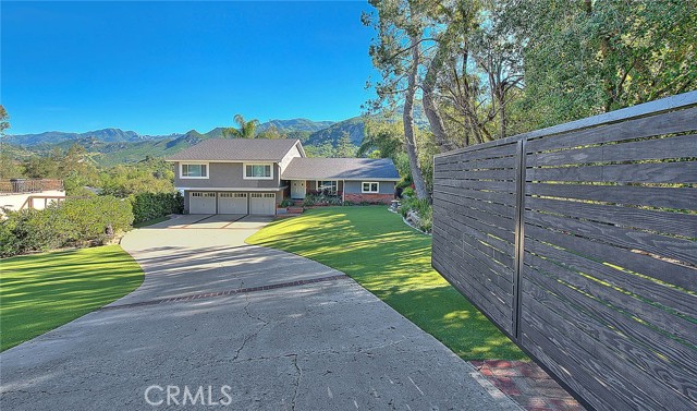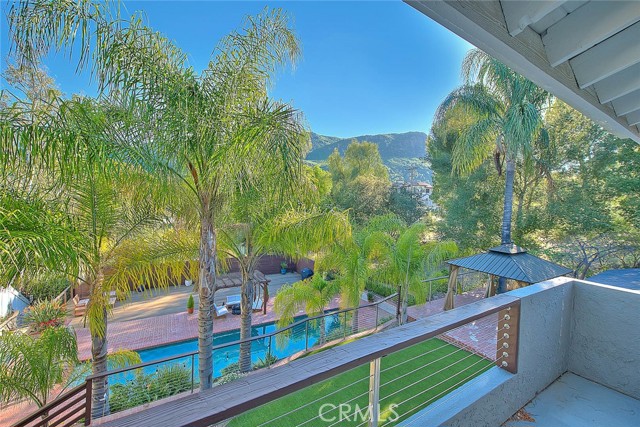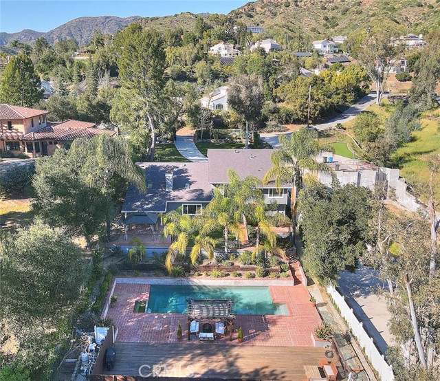 Gated private property nestled in the scenic Santa Monica Mountains, offering a blend of seclusion and natural surroundings, just minutes to Malibu and Malibu Lake. Set in a desirable location, the home provides a strong sense of privacy with tranquil landscapes and mountain views. Award-winning Las Virgenes School District! The spacious interior features 5 bedrooms (4 bedrooms per Title), offering flexibility for living, guests, or a home office. Light-filled living areas create a warm and inviting atmosphere, complemented by well-maintained real hardwood flooring throughout. The main level includes an open dining area with a skylight, bringing in abundant natural light, adjacent to the gourmet kitchen featuring ample cabinetry, pantry storage, generous counter space, stainless steel appliances, and a double-pane window overlooking the front yard. The lower level features a stunning double-sided fireplace serving both the living and family rooms, enhanced by two skylights above. The family room opens to the backyard through sliding glass doors with views of the gazebo. A wet bar is conveniently located next to the family room, adding functionality for entertaining. Two additional lower-level bedrooms share a 3/4 bathroom, including one bedroom with French doors leading to the backyard. Upstairs offers a primary suite with a sliding glass door opening to a private balcony, dual sinks, a walk-in closet, a separate shower, and a soaking tub with mountain views. Two additional suites each include walk-in closets, along with a separate room suitable for an office, library, or flexible use. The resort-style backyard features a large heated pool, spa, gazebo, and a large private wooden deck for entertaining, surrounded by natural landscaping with palm trees, creating a private outdoor retreat. Conveniently located near shopping, dining, hiking trails, and other local amenities.