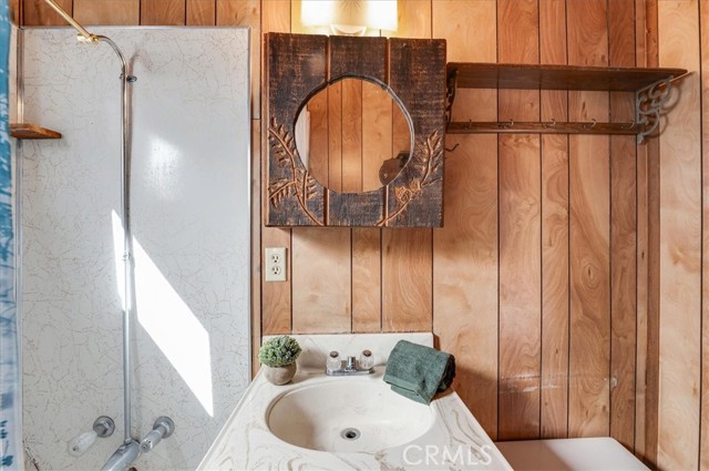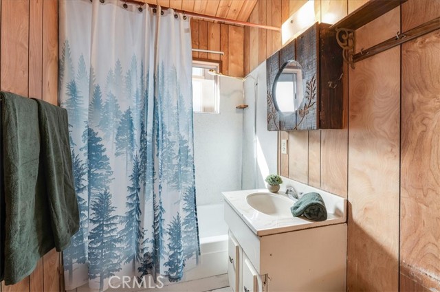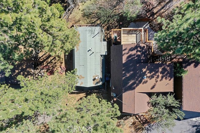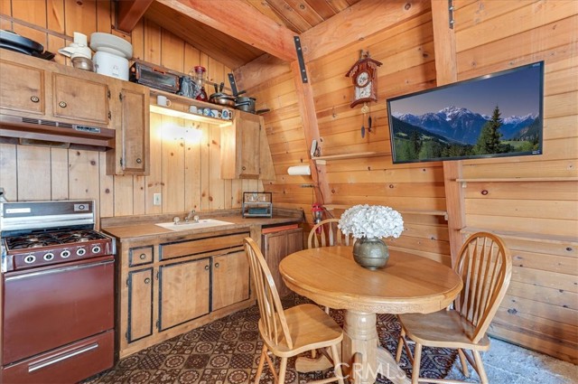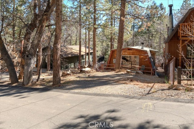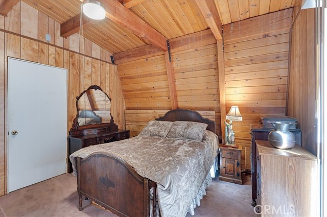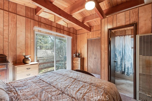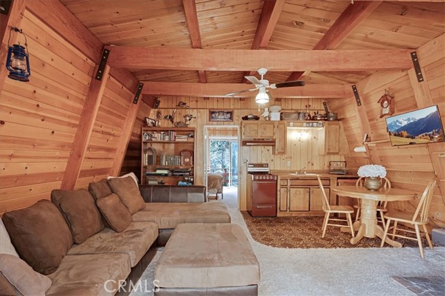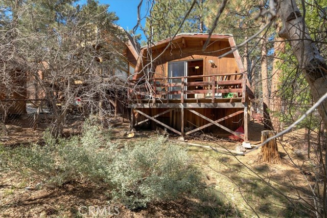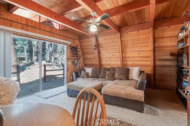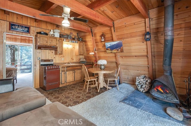 Charming vintage cabin nestled in a peaceful, wooded setting, offering the perfect opportunity for a fixer-upper or weekend retreat. This 1-bedroom, 1-bath home features exposed wood-beam ceilings, warm wood-paneled walls, and an inviting open living space filled with rustic character. The cozy living area is highlighted by a mid-century wood-burning fireplace, creating a perfect focal point for relaxing mountain evenings. The kitchen and dining area offer a functional layout with vintage charm, ready for your personal touch. The bedroom provides direct access to a private deck overlooking the natural surroundings—ideal for enjoying fresh air and tranquil views. Surrounded by mature trees, this property offers privacy and a serene atmosphere. Nine houses away from the National Forest.