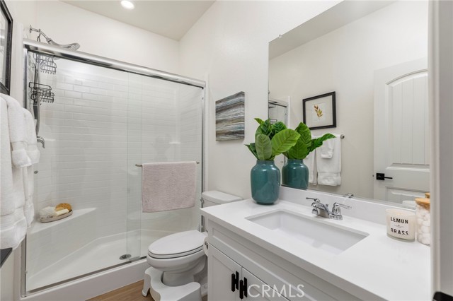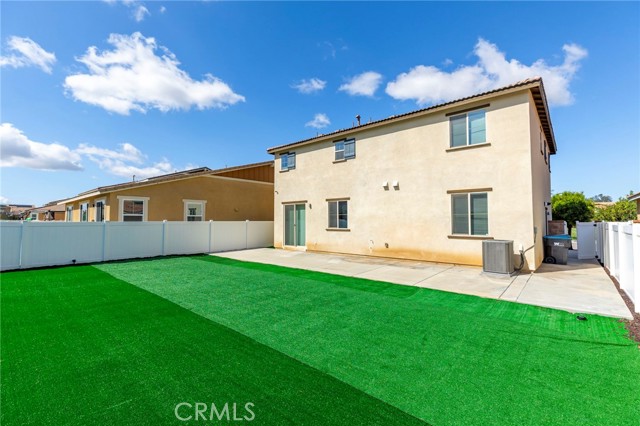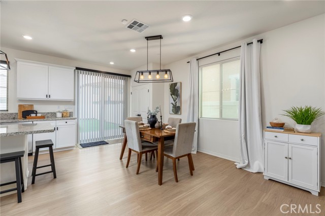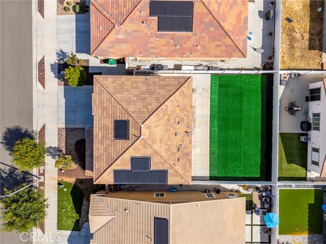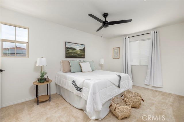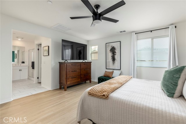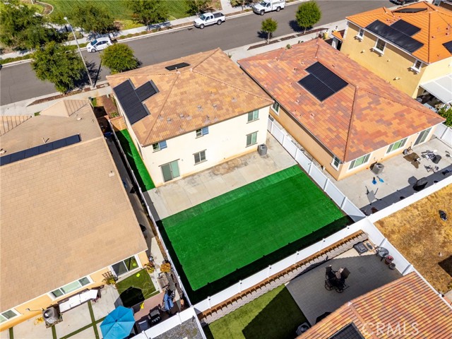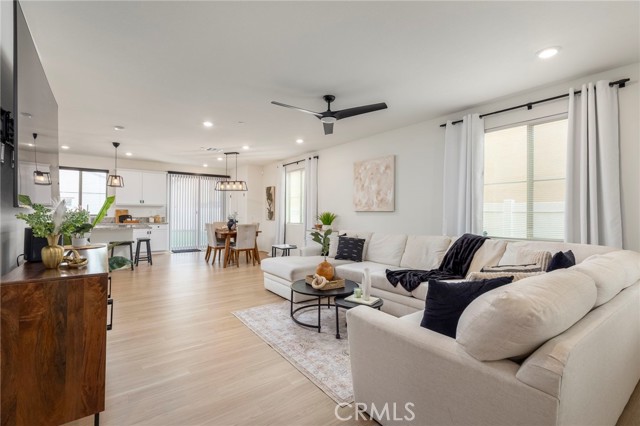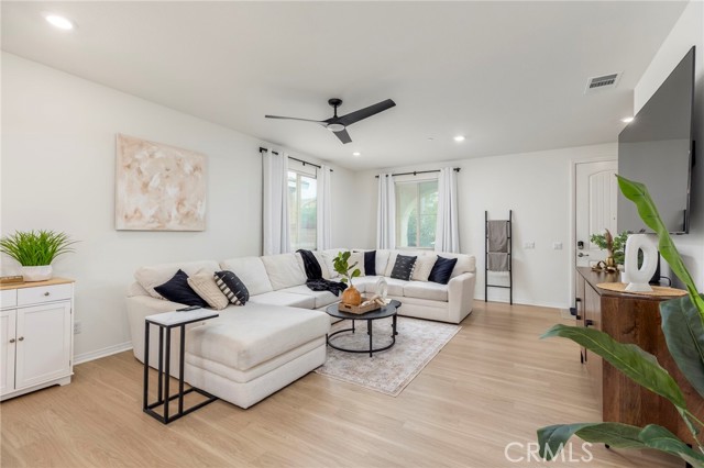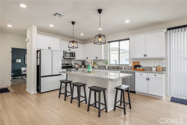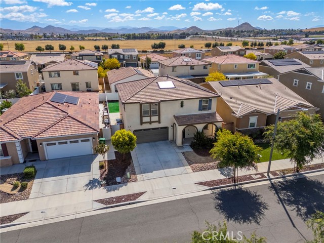 Built in 2021 and featuring fully Owned Solar, this stunning newer construction home offers the epitome of California living in the heart of Menifee! The spacious 2,400-square-foot floor plan includes four bedrooms (with a convenient guest room on the main level), three bathrooms and beautiful luxury vinyl plank flooring. Step inside to find a bright, open-concept living and dining space centered by a gourmet kitchen featuring white shaker cabinets, granite countertops, custom pendant lighting, and a large island with seating for four. The upper level hosts a versatile loft and three additional bedrooms, including a primary suite complete with an en-suite bathroom, dual walk-in closets, and double vanities. Upstairs bathrooms and laundry room feature modern updated tile. The kitchen refrigerator, washer/dryer, security system, and drinking water filtration system are all included! Practicality meets style with a dedicated laundry room full of storage shelving, while the expansive backyard and large patio provide the perfect setting for entertaining. As part of the vibrant Menifee Town Center community, residents enjoy resort-like amenities including a clubhouse, pool, dog park, and bike trails, all for a low HOA fee. With a pristine park right across the street and the shopping and dining of Menifee Countryside Marketplace within short walking distance, this is a rare opportunity that you must see in person!