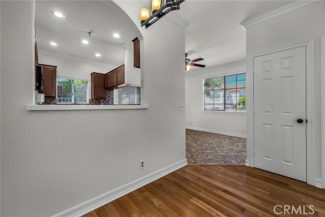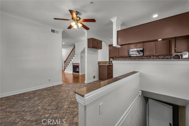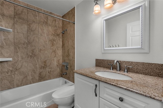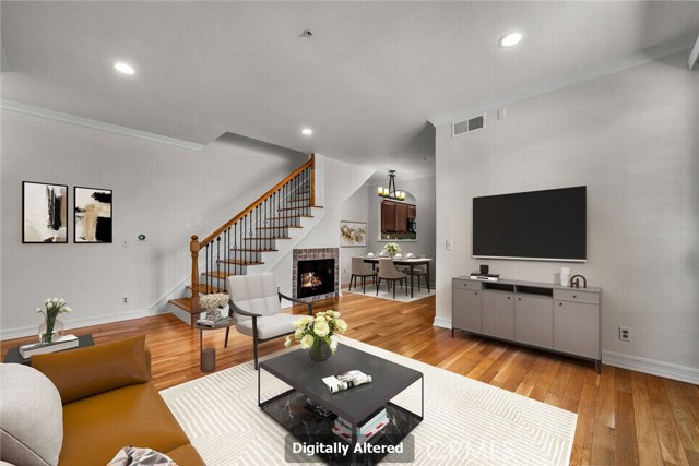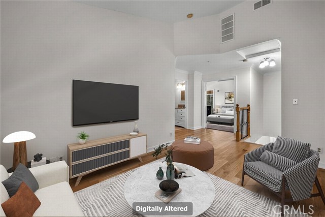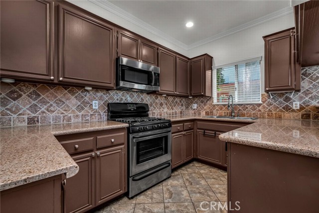 Stop the search—this is the townhome you’ve been waiting for. Beautifully upgraded tri-level residence, quietly tucked at the back of the complex, blending comfort, style, and everyday convenience. Designed for modern living and effortless entertaining, this light-filled home features soaring ceilings, abundant natural light, and an open, airy layout throughout. The main level welcomes you with a spacious living room highlighted by high ceilings, crown molding, recessed lighting, wood-style flooring, and a cozy fireplace. A sliding glass door opens to a large private balcony—perfect for morning coffee or evening relaxation. A convenient guest bathroom completes this level. The updated kitchen showcases warm Carmel-toned cabinetry, granite countertops, stone backsplash, stainless steel appliances, and decorative tile flooring, all opening seamlessly to a generous breakfast area ideal for casual dining. Upstairs, a decorative staircase leads to a versatile bonus area—perfect as a family room, home office, or media space. The expansive primary suite offers a peaceful retreat with a walk-in closet and an updated ensuite bathroom featuring a granite-top vanity and beautifully tiled step-in shower. The spacious secondary bedroom includes a mirrored closet and access to an updated hall bathroom with granite-top vanity and tub/shower combo. Both bedrooms enjoy direct access to a large, tranquil balcony, enhancing the indoor-outdoor flow. Additional highlights include a private two-car garage with washer and dryer, ample storage, and a well-maintained community featuring a pool, spa, and recreation room. Ideally located near shopping, dining, and with easy access to the 101 and 405 freeways, this home offers the perfect balance of comfort, convenience, and lifestyle.