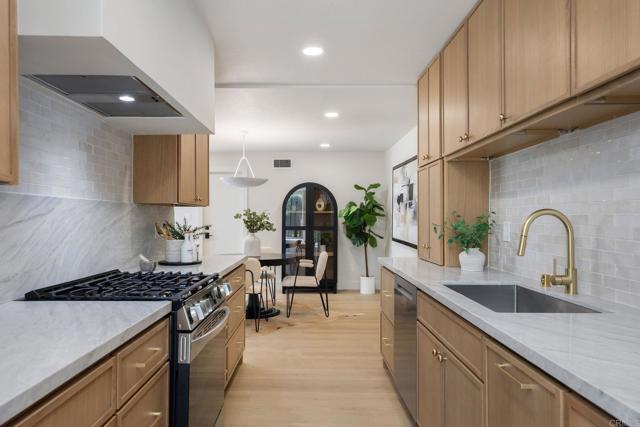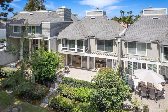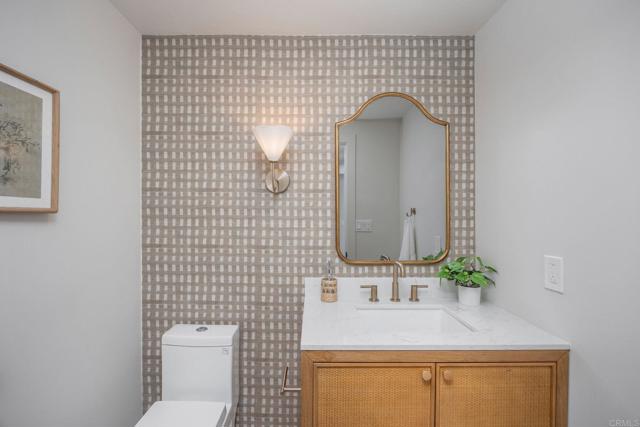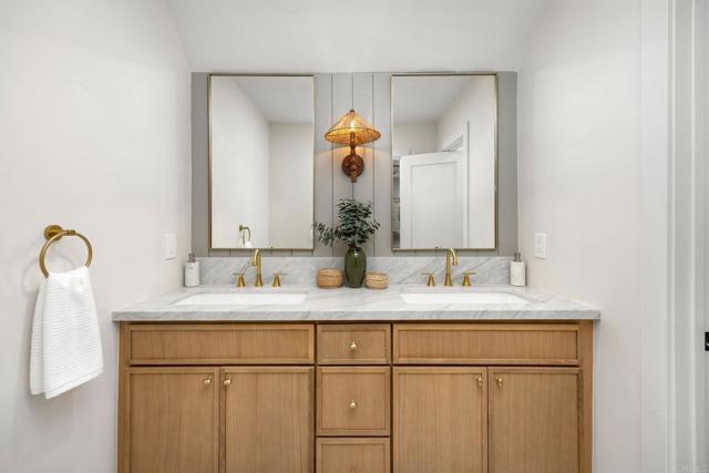 A private boat slip and 50 yards to Humboldt Beach — this thoughtfully remodeled home within gated Tennis Estates in Huntington Harbour offers rare harbor access paired with refined coastal living. Light wide-plank flooring runs through the open main level, where a fireplace with a sage green surround anchors the living room before flowing into a dining room framed by a shiplap wall and built-in dry bar. A breakfast room off the kitchen opens through sliding glass doors to a private patio. The galley kitchen is the design centerpiece: floor-to-ceiling white oak slim shaker cabinetry, white marble-look countertops, a glossy ceramic backsplash, and brushed gold hardware. Upstairs, the primary suite pairs a vaulted ceiling and wall of windows complemented by a dual white oak vanity ensuite, brushed gold fixtures, and a frameless glass shower with a built-in bench. The secondary bath offers its own distinct character with bold gray and white checkerboard tub surround, horizontal shiplap, and a rattan pendant, while a gingham-wallpapered powder room adds a stylish touch near the entry. An upstairs loft provides flexible additional living space. A tankless water heater and HOA-covered water, trash, dock maintenance, and access to a community pool, spa, tennis, pickleball, and basketball courts complete the picture. Located near Huntington Harbour Mall, Trader Joe's, and the beaches, this home delivers the lifestyle Huntington Harbour buyers rarely find available.