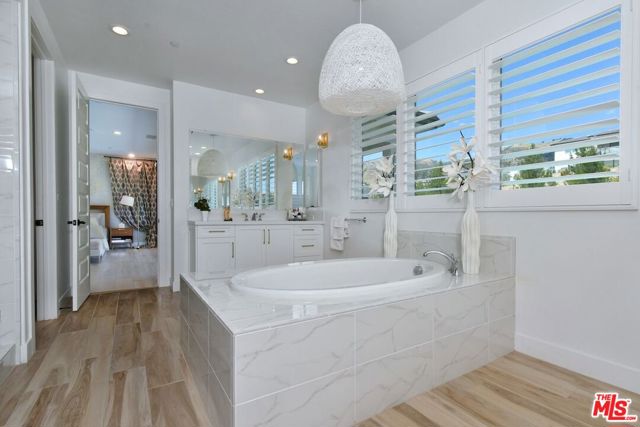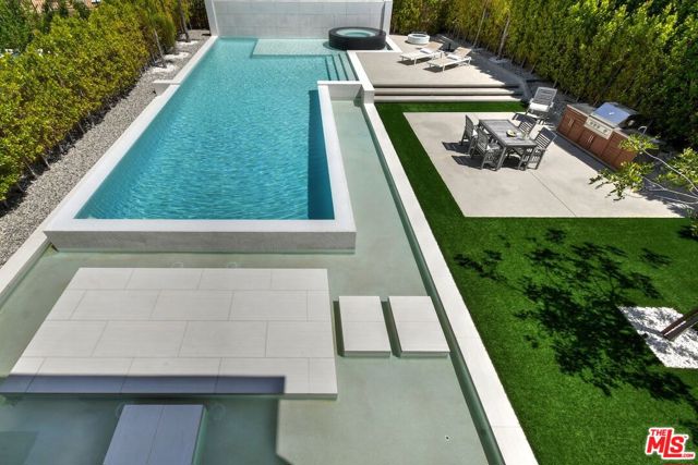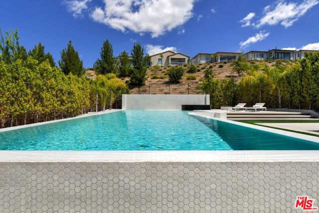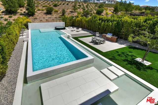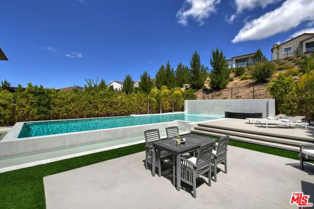 Welcome to Hillcrest at Porter Ranch, a beautifully upgraded home situated on one of the largest lots in the community (nearly 12,000 sq ft). A grand two-story foyer opens to a bright, open floor plan with a spacious great room, casual dining area, and seamless indoor-outdoor living. The chef's kitchen is designed for both style and function, featuring an oversized island, high-end stainless steel appliances, wine cellar, walk-in pantry, quartz countertops, designer lighting, custom backsplash, and a 6-burner gas stove. The first floor offers a private primary suite with full bath and separate entry ideal for guests or multi-generational living. Upstairs, a generous loft provides additional living space, along with a second primary suite featuring an expansive terrace with stunning mountain and pool views. Step outside to a resort-style backyard showcasing a saltwater infinity-edge pool with floating terrace, 18-ft lap lane, spa, and a dramatic 7-ft tiled water wall. Smart LED lighting, a built-in BBQ, and firepit create the perfect setting for entertaining. Additional highlights include a smart water heater and thermostats, custom fireplace, high-end shutters, security system, and in-ceiling speakers throughout the interior and exterior. Conveniently located to Porter Ranch Community School and just minutes from The Vineyards at Porter Ranch, offering premier shopping, dining, Whole Foods, and AMC Theatres.