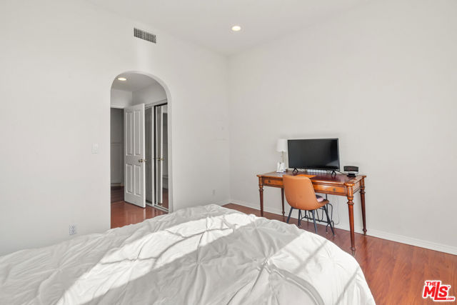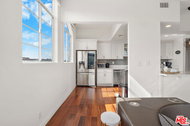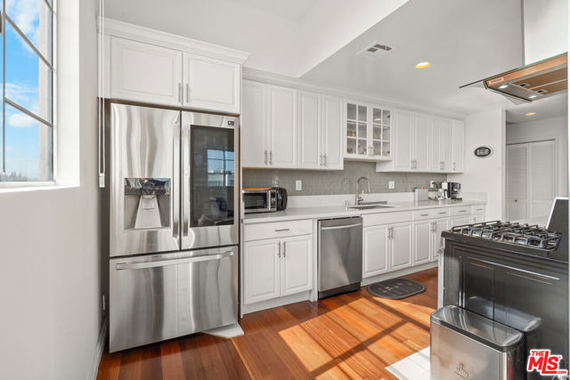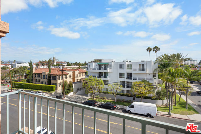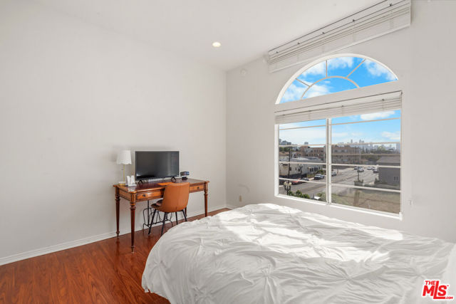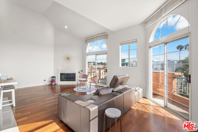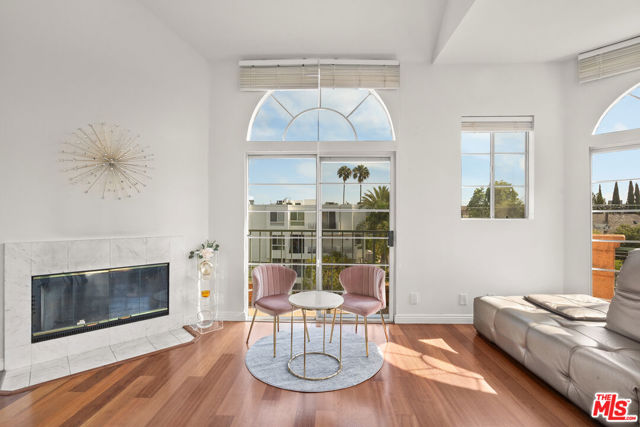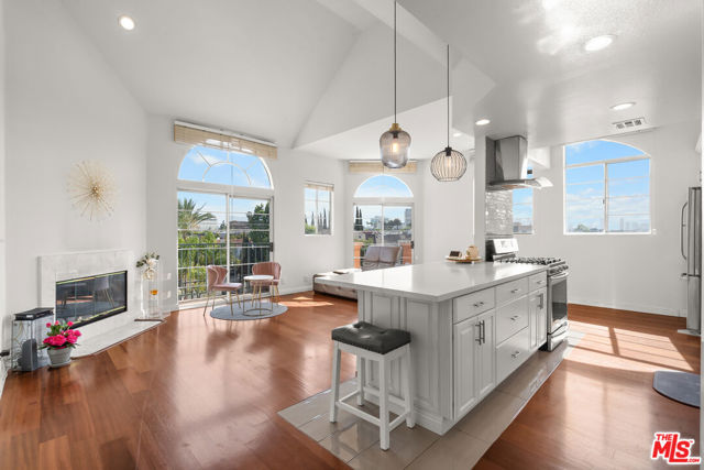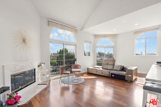 Perched atop the building, this exceptional North-East corner Penthouse offers sweeping DTLA skyline views and arguably one of the most desirable orientations in the entire complex. Flooded with natural light, the residence showcases soaring ceilings and a rare level of privacy, sharing only one wall with the unit below. Oversized windows crowned with elegant arched transoms invite abundant sunlight, enhancing the home's bright and refined ambiance. A gracious entry with wide hallways and double doors sets a sophisticated tone, leading into an expansive living space adorned with rich hardwood flooring and recessed lighting throughout. At the heart of the living room, a cozy fireplace anchors the space, while a private balcony provides the perfect setting to enjoy city views.The thoughtfully designed floor plan features well-separated bedrooms, offering ideal privacy. The open-concept kitchen seamlessly connects to the living area, highlighted by a center island, sleek countertops, and stylish cabinetry. Surrounded by windows, the kitchen enjoys a bright, airy feel reminiscent of a luxury hotel suite.The spacious primary bathroom features a double vanity, a soaking tub, and a separate shower, creating a spa-like retreat. Additional highlights include an in-unit side-by-side laundry closet with extra storage. Unlike typical units, Penthouse residents benefit from direct ground-level access to the parking area via Lorraine Blvd, avoiding the need to descend into subterranean levels. The unit includes two Side-by-Side parking spaces for added convenience.Located in the heart of Windsor Village, adjacent to the charming and historic Windsor Village Park, this home offers both tranquility and accessibility in one of the area's most sought-after neighborhoods.