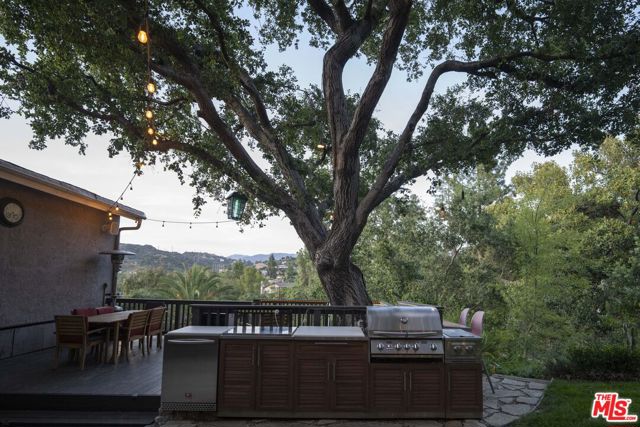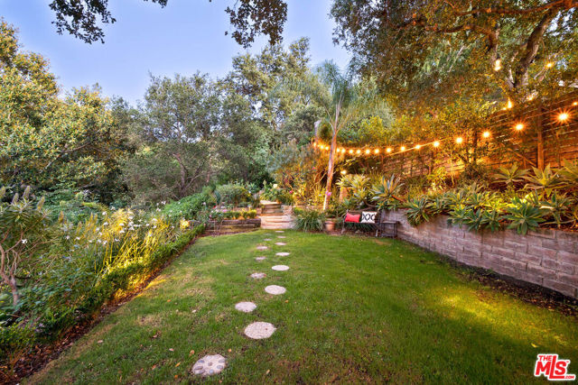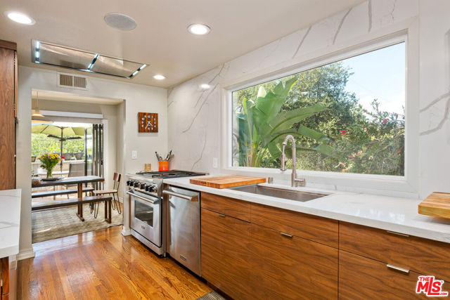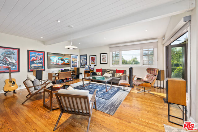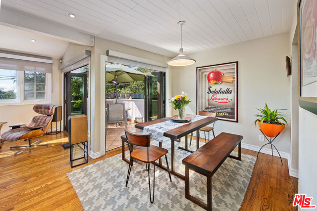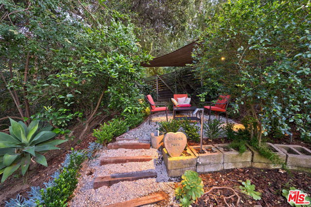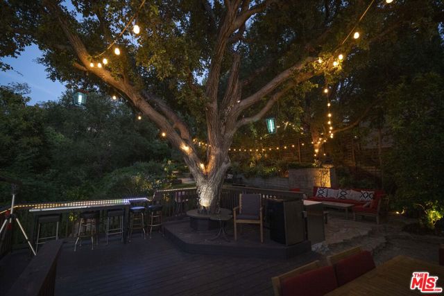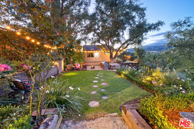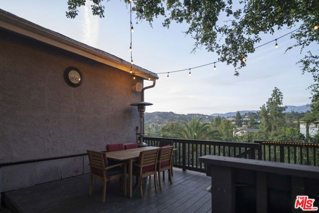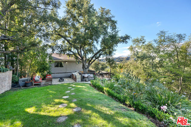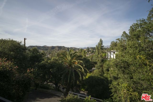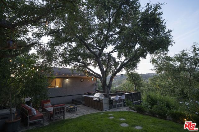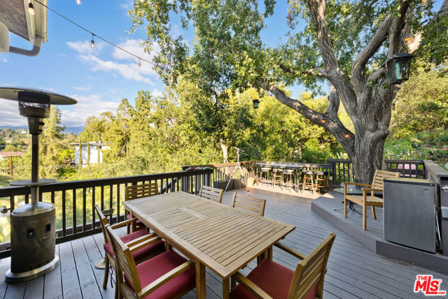 Perched on a secluded hillside in Eagle Rock, this stunning mid-century modern home sits on a private, tree-covered 10,000+ square foot corner lot an elevated oasis with sweeping views. Entry reveals a striking pebble garden framed by mature trees through a large picture window. The living room showcases classic mid-century elegance: soaring vaulted ceilings in crisp white paneling, oak hardwood floors, and abundant natural light. Expansive picture windows frame lush tree-top vistas, while built-in speakers fill the space with sound. Wide folding glass steel doors dissolve the boundary between indoors and out, opening to a tiled patio enveloped in potted greenery ideal for al fresco dining or relaxed entertaining. Just steps away, the sun-drenched dining room flows seamlessly from the living area, embodying effortless California living. The beautifully updated kitchen features warm walnut cabinetry, sleek Calacatta quartz countertops, a flush-mount ceiling hood, and full professional Viking stainless steel appliances. A large picture window bathes the space in light and overlooks verdant greenery, while a walk-in pantry includes stacked washer/dryer and generous shelving. Down the hall lies a spacious home office with built-in shelving, a large window, and an adjacent bathroom. Upstairs, three bright bedrooms with high ceilings, built in speakers so music can be played in every room, and plush carpet offer views through expansive windows. The hallway bathroom serves them, while the primary suite boasts a generous walk-in closet and luxurious steam shower. There are four instant hot water heaters. Outside, the landscaped backyard is a private retreat: a large deck with Ipe deck flooring with a built-in outdoor kitchen, grill, custom-built circular tree bench and fire pit; a lush grassy lawn and fruit trees; and a stepping-stone path winding beneath mature, string-lit trees. Panoramic hillside views stretch to the iconic Eagle Rock landmark. The property includes a two-car garage and an enclosed carport with car lifts, accommodating up to six vehicles. Blending timeless charm, modern versatility, and unbeatable location, this home offers tranquil hillside living just minutes from Eagle Rock's vibrant cafes and restaurants along Colorado Blvd, local parks, grocery stores, and Pasadena's historic charm.