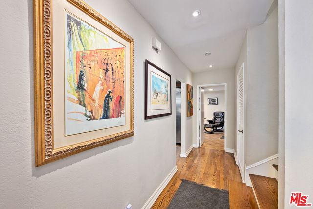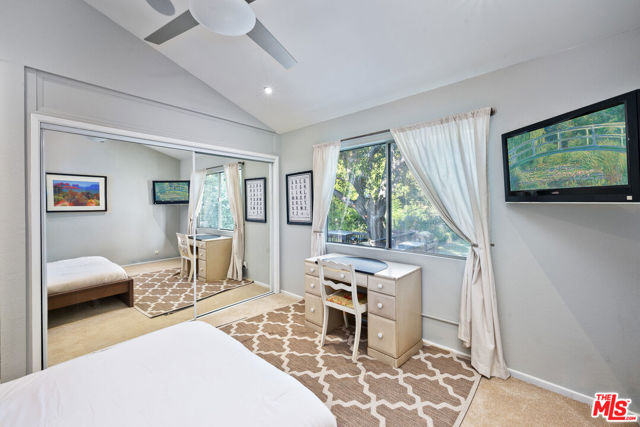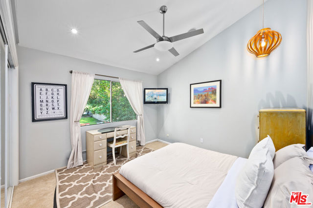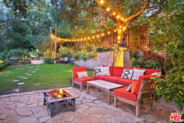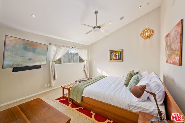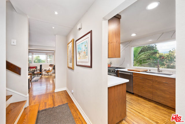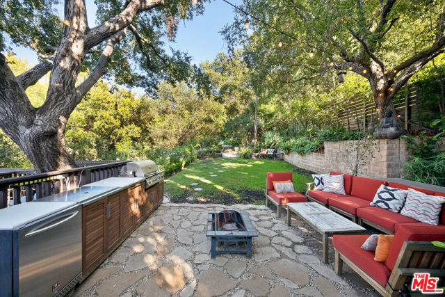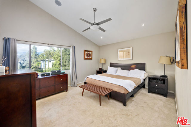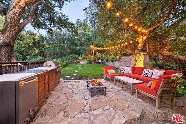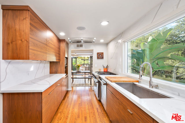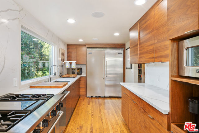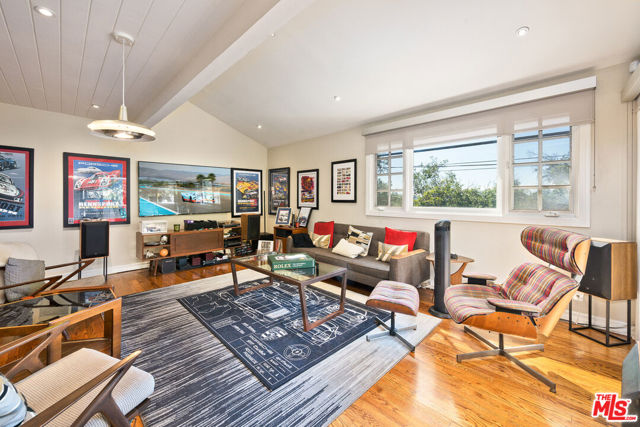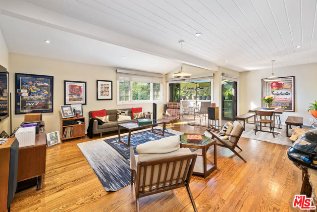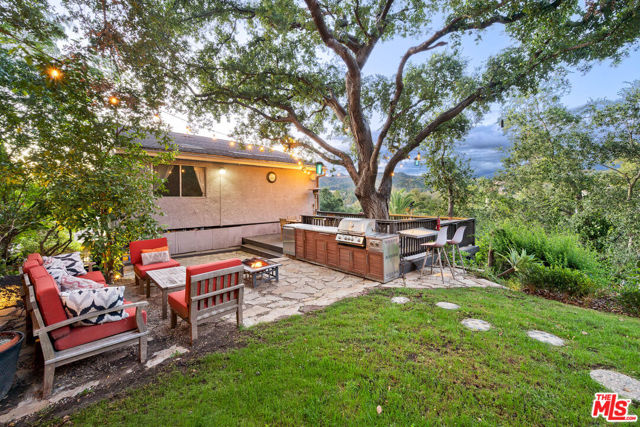 Perched on a secluded hillside in Eagle Rock, this stunning mid-century modern home sits on a private, tree-covered 10,000+ square foot corner lot an elevated oasis with sweeping views. Entry reveals a striking pebble garden framed by mature trees through a large picture window. The living room showcases classic mid-century elegance: soaring vaulted ceilings in crisp white paneling, oak hardwood floors, and abundant natural light. Expansive picture windows frame lush tree-top vistas, while built-in speakers fill the space with sound. Wide folding glass steel doors dissolve the boundary between indoors and out, opening to a tiled patio enveloped in potted greenery ideal for al fresco dining or relaxed entertaining. Just steps away, the sun-drenched dining room flows seamlessly from the living area, embodying effortless California living. The beautifully updated kitchen features warm walnut cabinetry, sleek Calacatta quartz countertops, a flush-mount ceiling hood, and full professional Viking stainless steel appliances. A large picture window bathes the space in light and overlooks verdant greenery, while a walk-in pantry includes stacked washer/dryer and generous shelving. Down the hall lies a spacious home office with built-in shelving, a large window, and an adjacent bathroom. Upstairs, three bright bedrooms with high ceilings, built in speakers so music can be played in every room, and plush carpet offer views through expansive windows. The hallway bathroom serves them, while the primary suite boasts a generous walk-in closet and luxurious steam shower. There are four instant hot water heaters. Outside, the landscaped backyard is a private retreat: a large deck with Ipe deck flooring with a built-in outdoor kitchen, grill, custom-built circular tree bench and fire pit; a lush grassy lawn and fruit trees; and a stepping-stone path winding beneath mature, string-lit trees. Panoramic hillside views stretch to the iconic Eagle Rock landmark. The property includes a two-car garage and an enclosed carport with car lifts, accommodating up to six vehicles. Blending timeless charm, modern versatility, and unbeatable location, this home offers tranquil hillside living just minutes from Eagle Rock's vibrant cafes and restaurants along Colorado Blvd, local parks, grocery stores, and Pasadena's historic charm.
