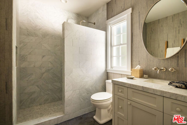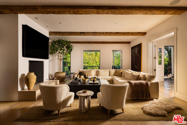 Tucked behind private gates and enveloped by lush, mature landscaping, this turn-key traditional farmhouse rests on a coveted street-to-street lot from Elkins to Oakmont, embodying timeless style and enduring Brentwood elegance. Beyond a meandering, tree-lined drive, the home opens to an inviting front patio that sets the tone for the refined interiors within. A sunlit foyer leads to the family room, where French doors invite indoor-outdoor living and bespoke furnishings by acclaimed designer Rachael Goddard define a sophisticated yet effortless aesthetic. The chef's kitchen, anchored by a grand island and professional-grade appliances, includes a bright breakfast nook and expansive butler's pantry. The dining room, perfect for intimate dinners or grand soires, seamlessly extends to the formal living room and serene outdoor setting. Upstairs, the primary suite is a private sanctuary with a sitting room, fireplace, and balcony, complemented by his-and-hers baths and generous custom closets. Four additional en-suite bedrooms, each with walk-in closets, provide comfort and privacy for family and guests. The lower level is an entertainer's paradise, featuring direct garage access, a mudroom, open entertaining space, a second kitchen, powder room, home theater, expansive wine storage, and a private bedroom with exterior entrance and steam shower. The grounds reveal a luxurious outdoor retreat for elevated entertaining and utmost relaxation, with a fully equipped kitchen and pizza oven, alfresco dining terraces, a tranquil wood-paneled hot tub, and a new sauna framing cinematic city vistas. Additional amenities include an elevator, whole-home water filtration, a Control4 smart system, a dedicated laundry room, and a stately home office, thoughtfully designed to elevate modern living with ease, style, and sophistication. Private yet perfectly connected, this Brentwood residence is moments from the Brentwood Country Mart, premier country clubs, celebrated dining, and top schools, epitomizing the pinnacle of Westside living. 664 Elkins Rd offers unparalleled privacy, timeless design, and a lifestyle tailored to the most discerning admirers. Truly a property not to be missed.