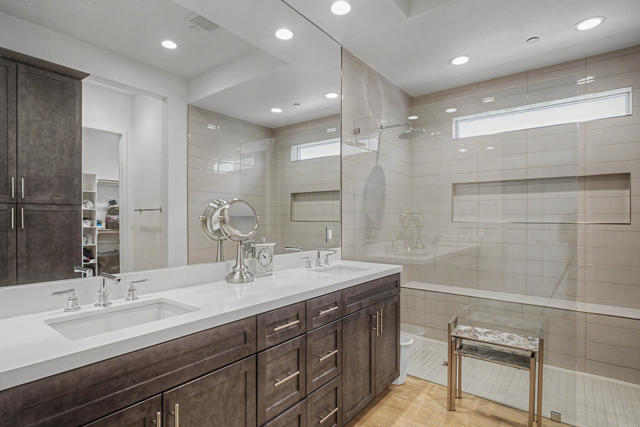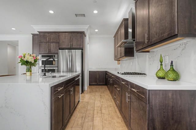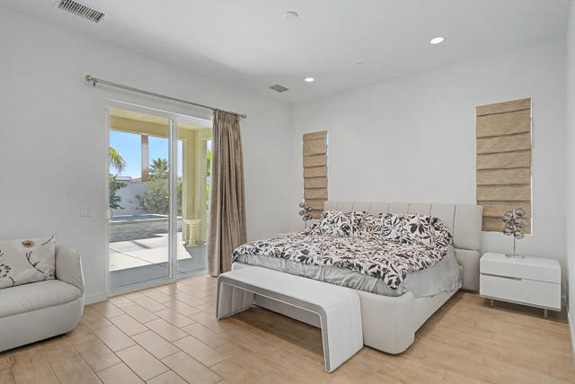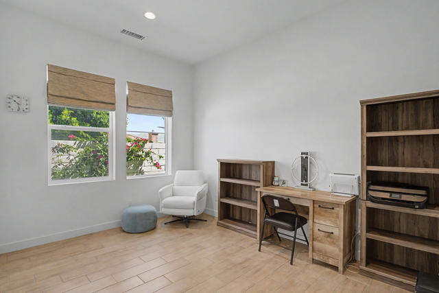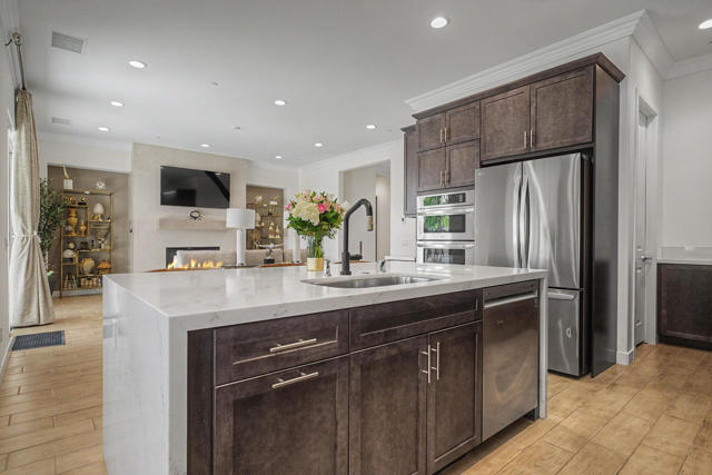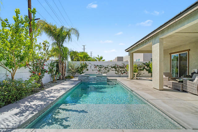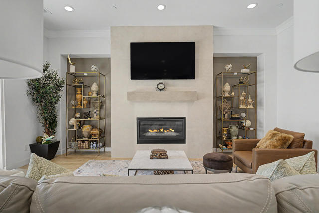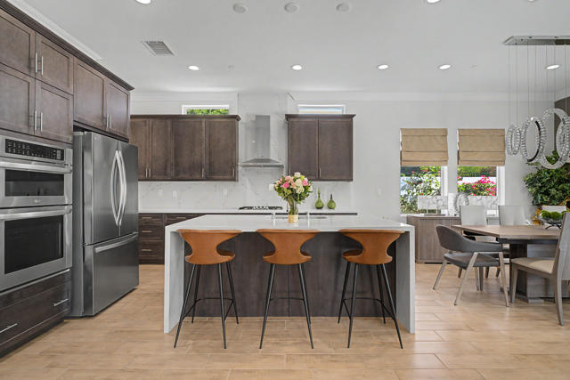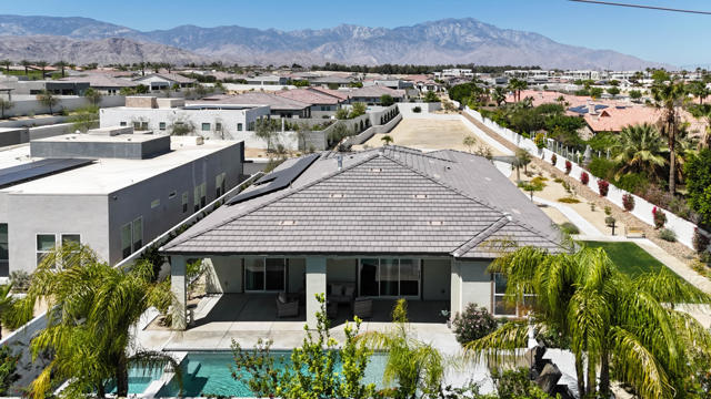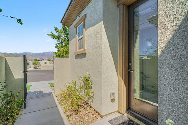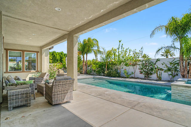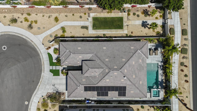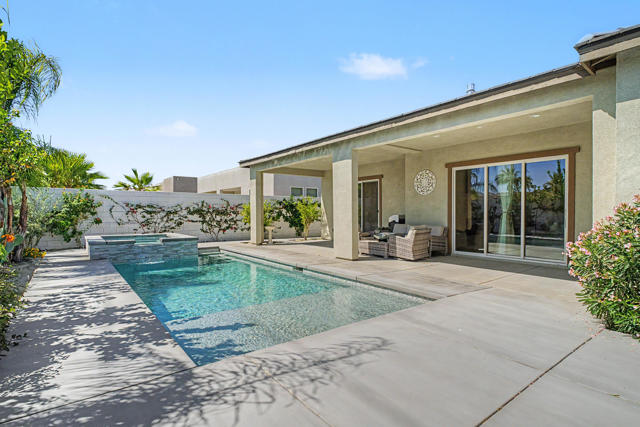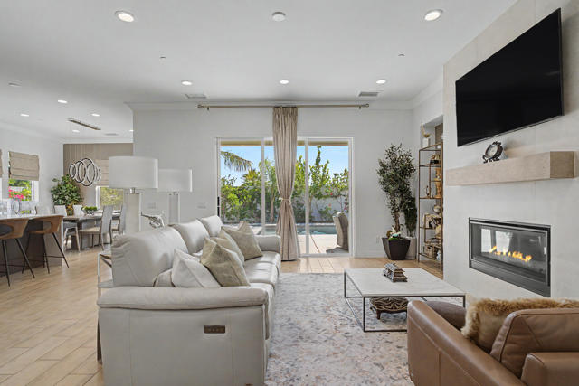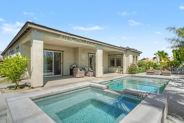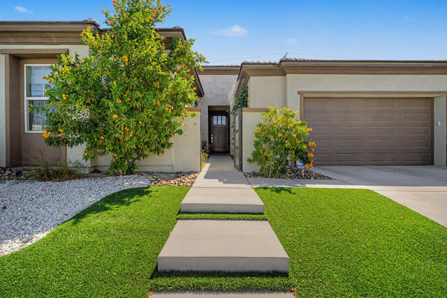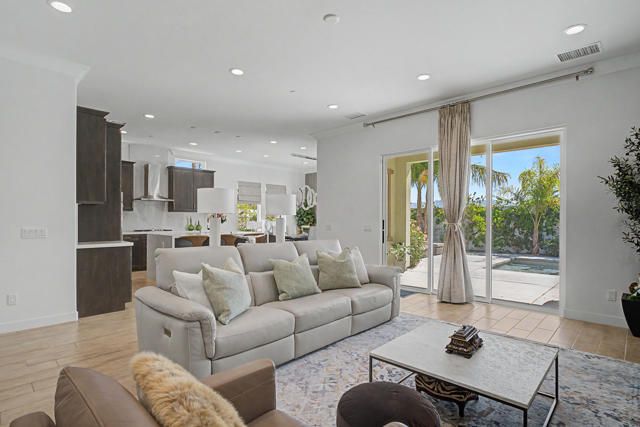 Nestled on a cul-de-sac in Montage Palm Desert with only one neighboring home, this highly upgraded residence offers exceptional privacy, owned solar, and mature, lush landscaping throughout the front and rear yards. A private courtyard entry leads to an attached casita with its own entrance and full bath - ideal for guests, multigenerational living, or flexible use.Inside, the home showcases an open-concept design with soaring ceilings, custom crown molding, and designer window treatments that enhance natural light and scale throughout. The great room features a fireplace and flows seamlessly into a gourmet kitchen with premium stainless appliances, a walk-in pantry, and an oversized island with bar seating - perfect for entertaining. A versatile teen/flex room adds additional living space, ideal for a media room, office, or playroom.All bedrooms are en suite, including a primary suite with direct backyard access, dual walk-in closets, and a spa-style bath with a walk-in shower.Seamless indoor-outdoor living is achieved through retractable glass doors opening to a covered patio and a resort-style backyard complete with a custom pool and spa, fruit trees, and thoughtfully designed landscaping offering both privacy and ambiance. Conveniently located near premier dining, shopping, golf, and future lifestyle destinations.