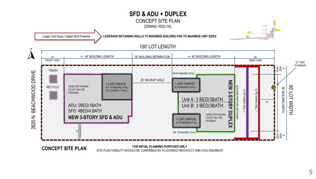 High up on Beachwood Drive in the shadow of the Hollywood Sign sits one of the most iconically located multifamily zoned lots in the City of Los Angeles. The offering presents a rare opportunity to pursue multiple viable development strategies, allowing buyers to balance construction cost, unit size, and yield base on their specific investment approach. One potential redevelopment typology would be SFR & ADU + Duplex - outlined with greater detail herein under two retaining wall options. The sale includes APN “012” which is a dramatically sloped R1 lot directly adjacent/behind the subject. The property is currently permitted for a “remodel” of the existing 1,432 SF SFR to a 3,337 SF SFR and 477 SF JADU with pool. Those plans, associated work product (including ALTA, TOPO, geotechnical reports), and permit payment invoices are available within the property due diligence folder.