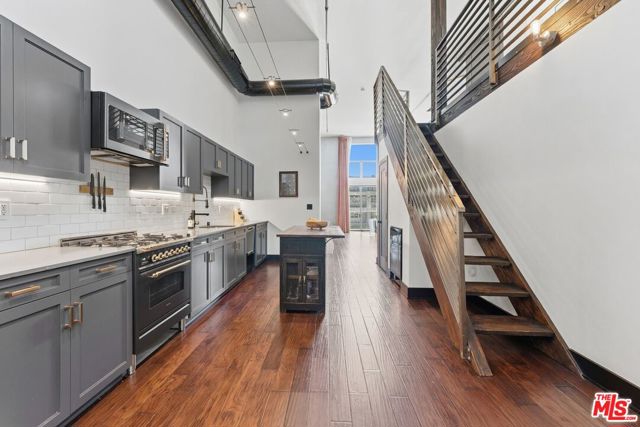 The ultimate in loft style living - this is the one you've been waiting for. Welcome to this stunning, remodeled top-floor loft an entertainer's dream set in one of the Marina's most vibrant and creative pockets. Dramatic 17+ foot ceilings and a wall of floor-to-ceiling windows flood the space with natural light, creating a bright, open atmosphere enhanced by custom drapery for a true designer finish. The open-concept layout is both functional and striking, featuring a custom speakeasy-style bar perfect for entertaining or unwinding in style. The kitchen is a showpiece, outfitted with sleek quartz countertops and premium appliances including a Viking Pro refrigerator, Ilve range, and Fisher & Paykel dishwasher. Both bathrooms have been thoughtfully elevated with copper sinks, marble counters, custom tile work, smart mirror lighting, and Toto bidet toilets. The main level offers a private guest suite with en-suite bath, while the upstairs mezzanine features a spacious primary retreat complete with a walk-in closet, room for a home office, and architectural views that enhance the loft's unique character. Additional highlights include new HVAC (2024), custom cabinetry and doors, upgraded lighting throughout, EV charging, guest parking, and access to a community rooftop deck with sweeping city views. located in a highly walkable neighborhood just moments from shops, parks, restaurants, and the beach offering the ultimate blend of convenience and coastal lifestyle.
