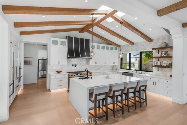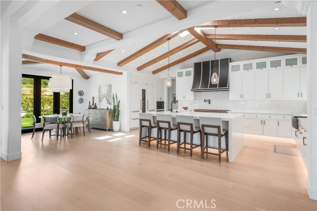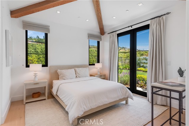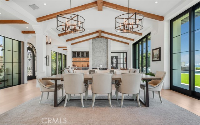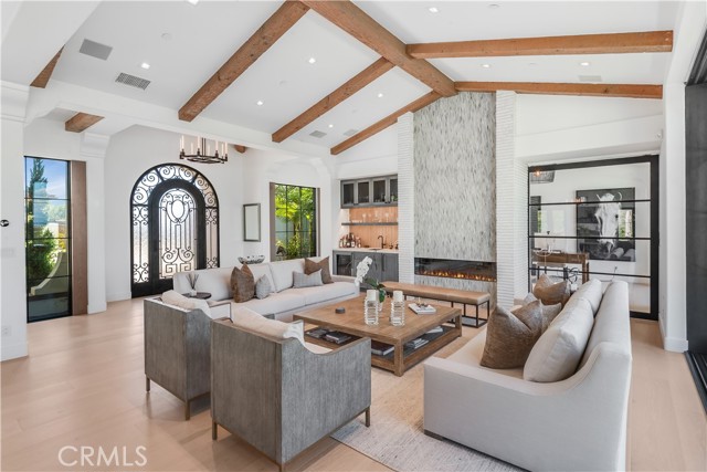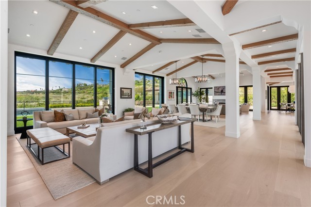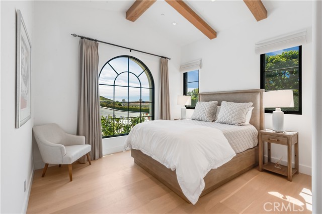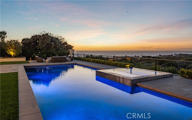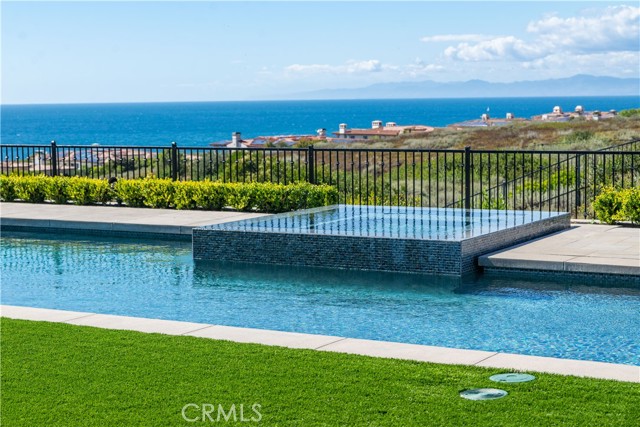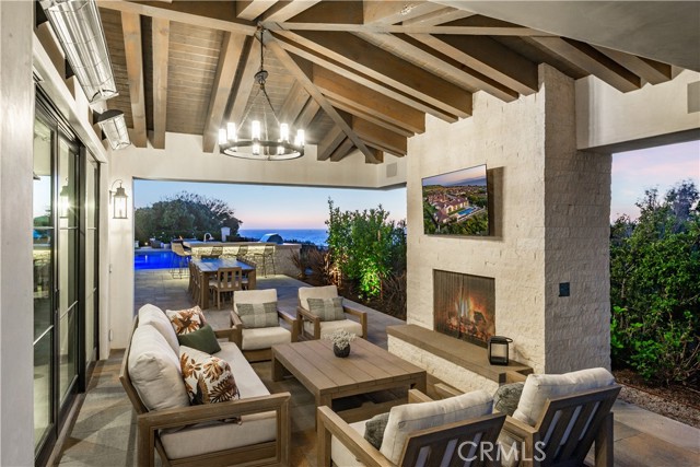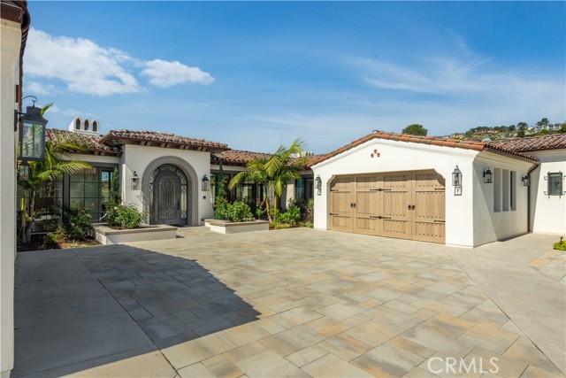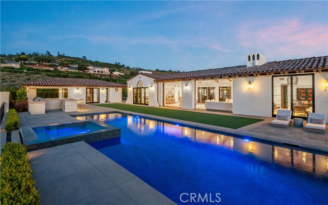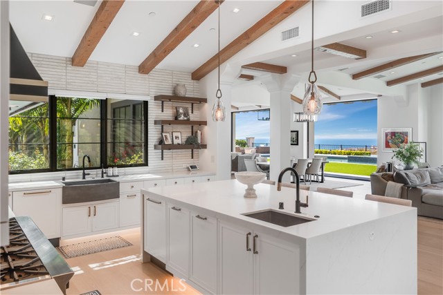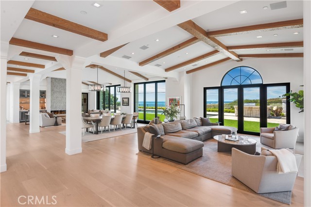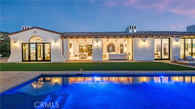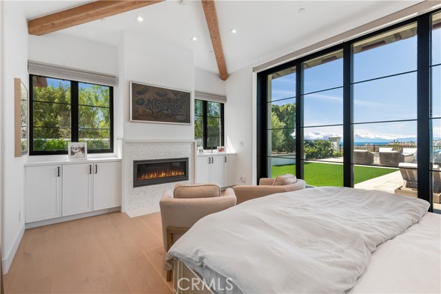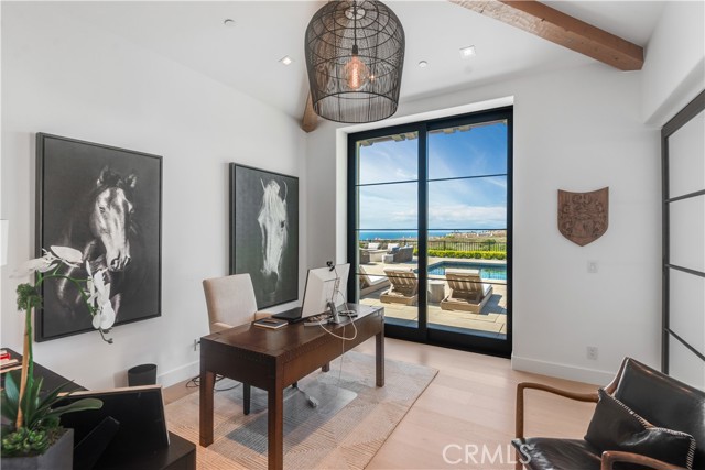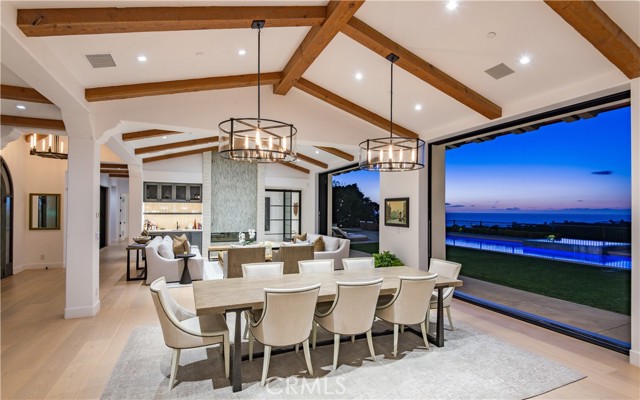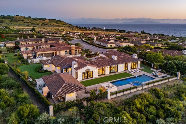 Rarely does a true one-level estate of this scale come to market, especially one with expansive ocean views. Completed in December of 2023, this custom-built residence is truly one of a kind, offering five bedrooms plus an office, six-and-a-half bathrooms, and 5,776 square feet of living space, plus two, 2-car garages on an approximately 25,000 square foot lot. A dramatic custom glass front door sets the stage. Once inside, wide-plank wood floors, exposed beam ceilings, and walls of glass fill the home with natural light while creating a seamless connection to the resort-inspired backyard. A huge saltwater pool and spa, fire pit, BBQ station, and sweeping ocean views elevate the outdoor experience, while the adjacent loggia with a fireplace offers the perfect place to unwind. The detached ADU/exercise room includes a private sauna, adding another layer of thoughtful luxury. At the heart of the home, the spectacular kitchen is anchored by a massive center island and framed by vaulted, beamed ceilings with skylights that flood the space with natural light. A chef-grade BlueStar range, Sub-Zero refrigerator, Miele dishwashers, custom cabinetry, and quartz counters complete the space. Each bedroom enjoys an ensuite bathroom, and a beautifully positioned office takes full advantage of the ocean views. State-of-the-art amenities include an ELAN home automation system, Lutron lighting, and built-in speakers throughout the home and outdoor spaces. A unique opportunity to enjoy single-level living, exceptional design, along with expansive ocean views.