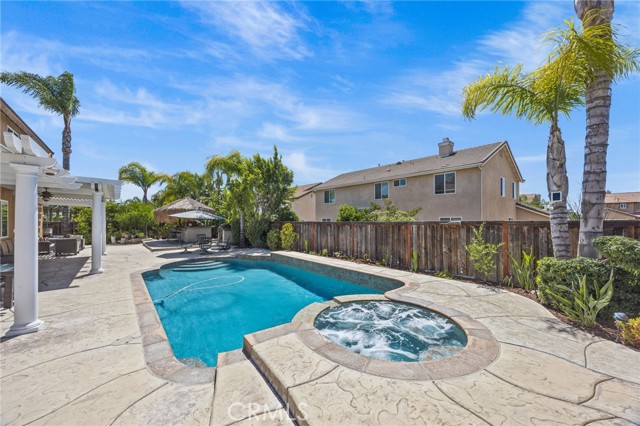 Welcome to the highly sought-after Orangecrest community—where elegance, comfort, and lifestyle come together to welcome you home. Tucked away on a quiet cul-de-sac, this stunning residence offers the perfect blend of sophistication and warmth. From the moment you arrive, the inviting front porch sets the tone—an ideal space to enjoy peaceful mornings with coffee or unwind in the evening. Step through the double doors and into a light-filled formal living room, where soaring vaulted ceilings and expansive windows create a sense of openness and effortless luxury. A striking staircase draws your eye upward, hinting at the thoughtfully designed spaces that await. On the main level, versatility meets convenience. A private office provides the perfect setting for productivity, while a downstairs bedroom with its own en-suite bath offers comfort and privacy for guests or multi-generational living. An additional flexible room can easily serve as a second office, media room, or play space. At the heart of the home, the gourmet kitchen is designed to impress—featuring a spacious walk-in pantry, granite island, custom cabinetry, and stainless steel appliances. Perfectly positioned to overlook the backyard, it opens seamlessly to the family room, creating an ideal space for gathering, entertaining, and everyday living. Upstairs, a generous landing offers a welcoming retreat—perfect as a reading nook, lounge, or creative space—complete with built-in cabinetry and views overlooking the living area below. Each bedroom is thoughtfully designed with its own full sized bathroom and walk-in closet, ensuring comfort and privacy throughout. The primary suite is a true sanctuary, featuring a spacious sitting area, spa-inspired bathroom with dual vanities, soaking tub, walk-in shower, and an expansive walk-in closet. Every detail is designed for relaxation and refined living. Step outside to your private backyard oasis—beautifully landscaped and designed for unforgettable gatherings. Whether hosting elegant soirées, weekend BBQs, or poolside celebrations, this space delivers. Mature fruit trees, a cabana, and a solar-heated pool and spa complete the experience, allowing for year-round enjoyment. This is more than a home—it’s a lifestyle designed for growing families, successful professionals, and anyone who loves to entertain.